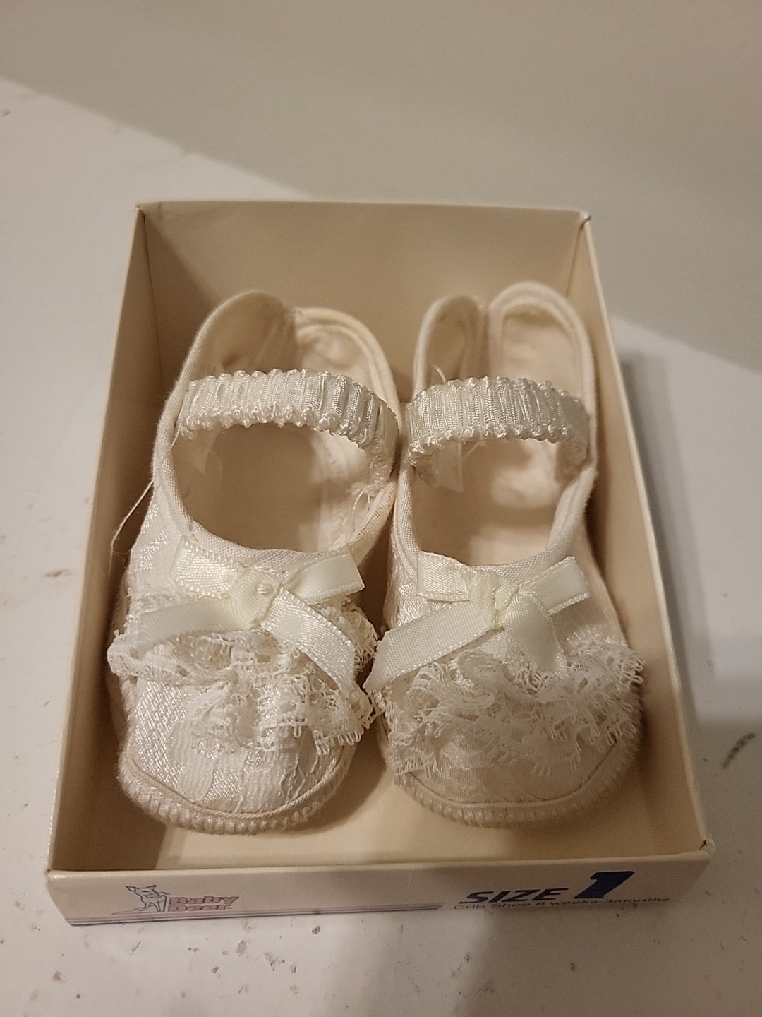 Baby Deer VTG Lace Satin Bow Detail Infant Crib Bootie Shoes Size 1 NEW