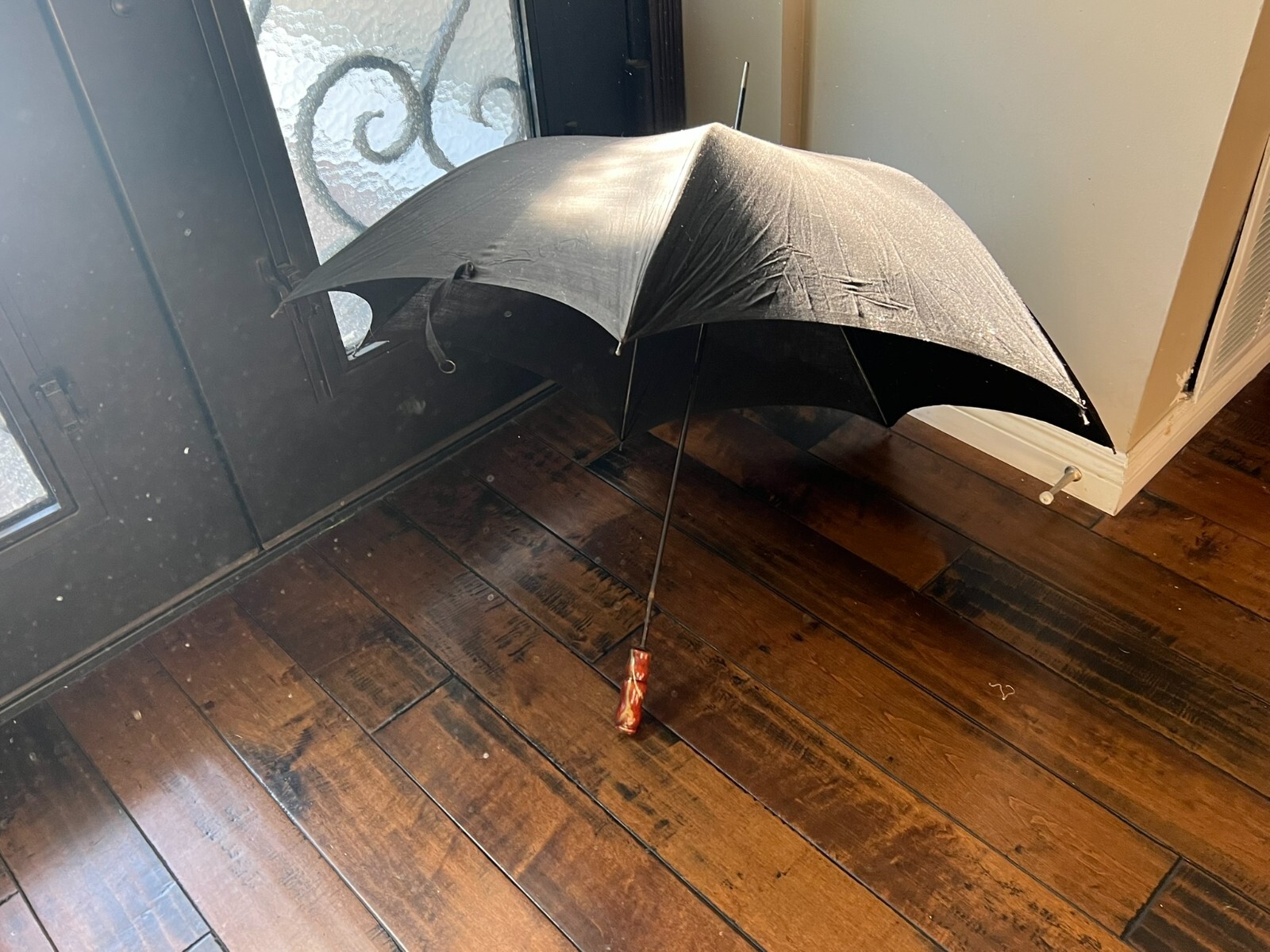 Vintage VICTORIAN BLACK FABRIC UMBRELLA Antique Parasol Wood Handle