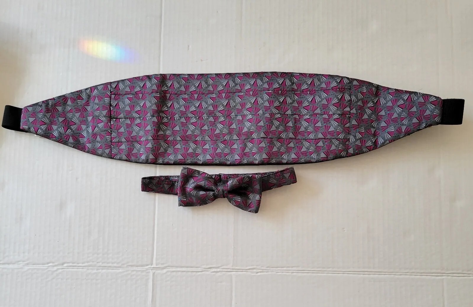 как выглядит Mens Pink Gray Satin Cummerbund and matching tie Bow Tie Size 27-50 Made USA фото