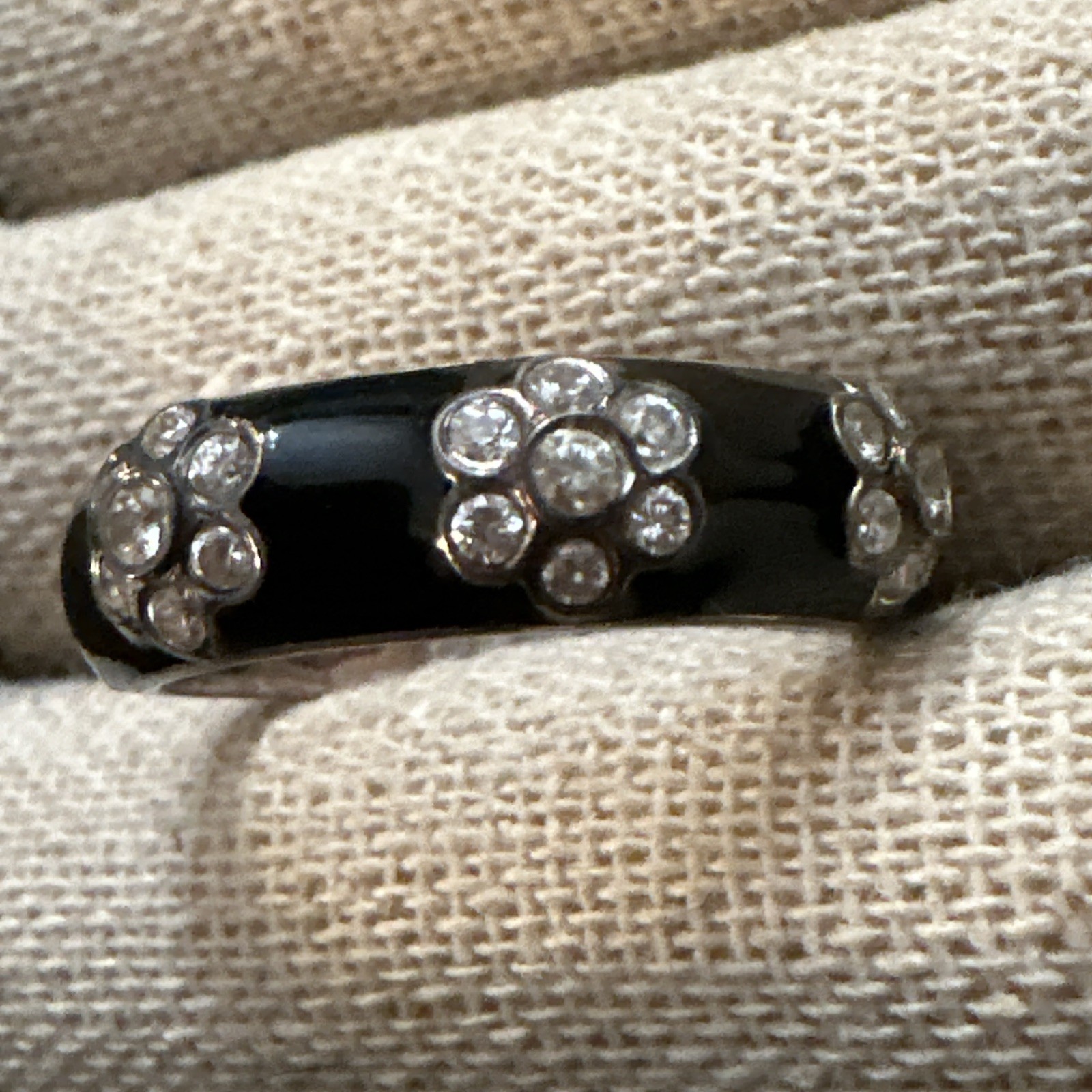 как выглядит VINTAGE 925 STERLING SILVER BLACK ENAMELED FLOWER WHITE STONE BAND RING фото