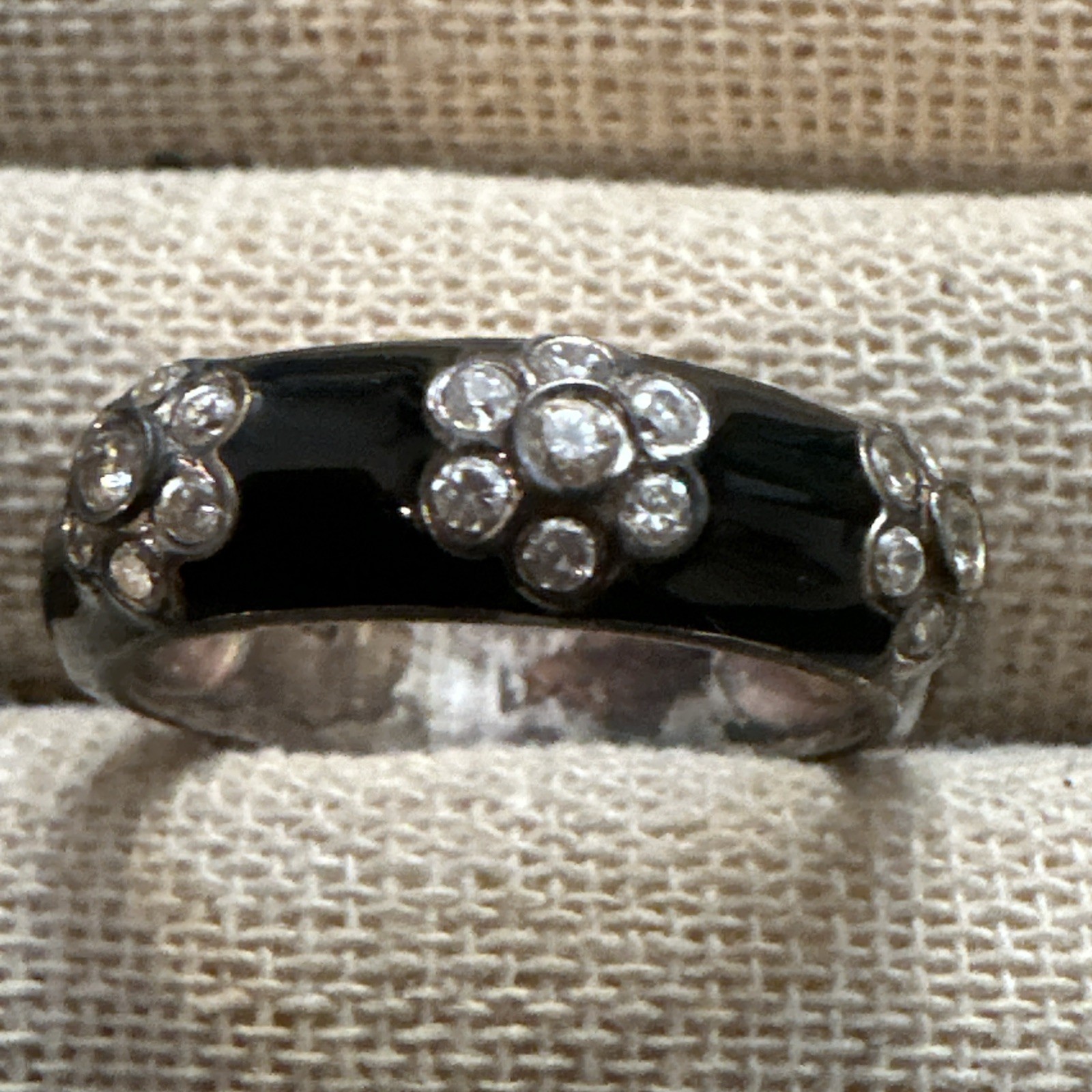 VINTAGE 925 STERLING SILVER BLACK ENAMELED FLOWER WHITE STONE BAND RING