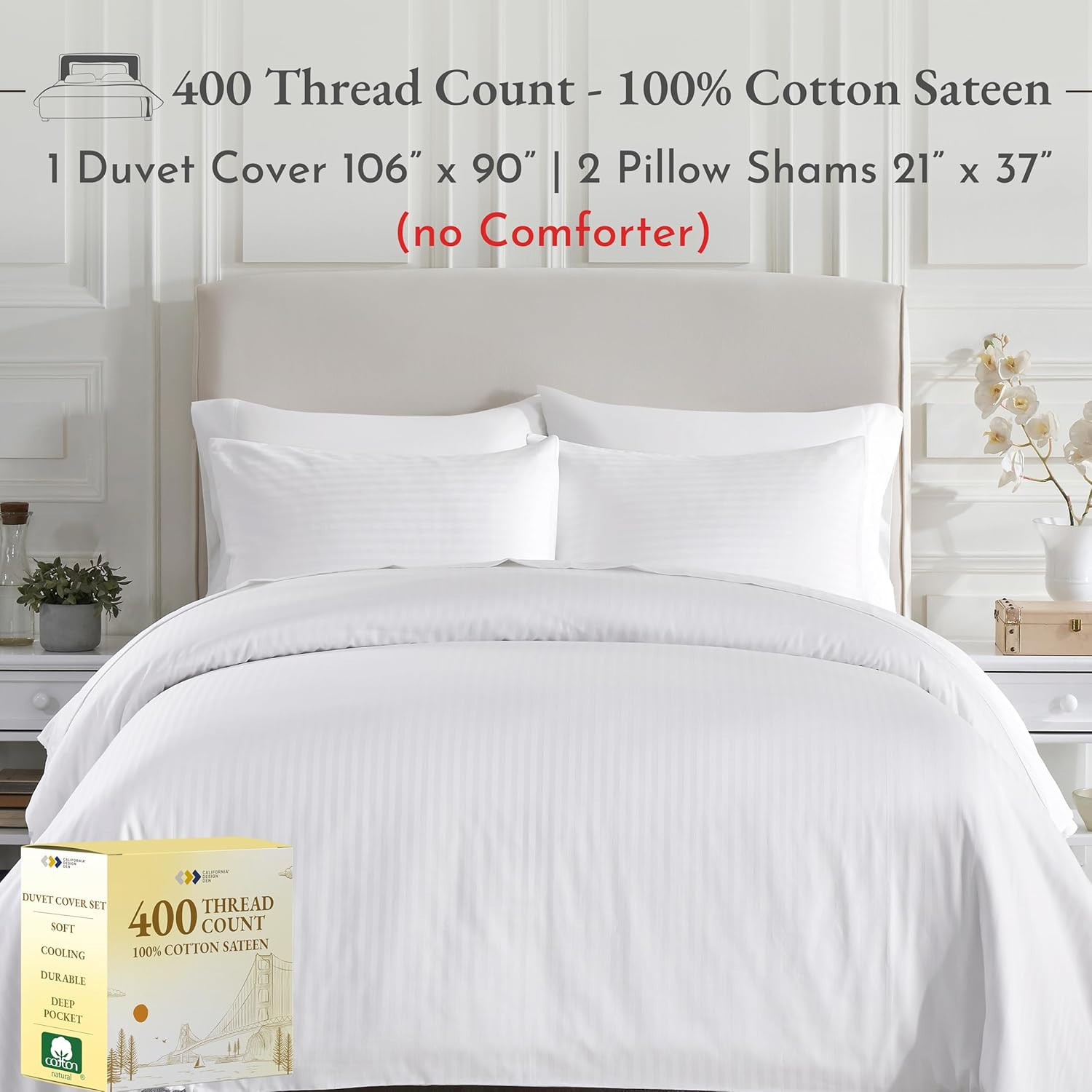 King Size Duvet Cover Set, Premium 400 Thread Count 100 Cotton Sateen, Hotel Qu
