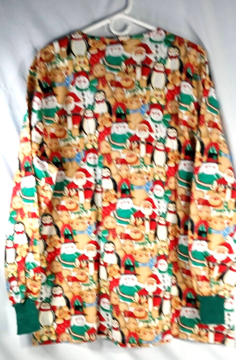 Cherokee Christmas Scrub Top Large Long Sleeve Multicolored Green Red Beige
