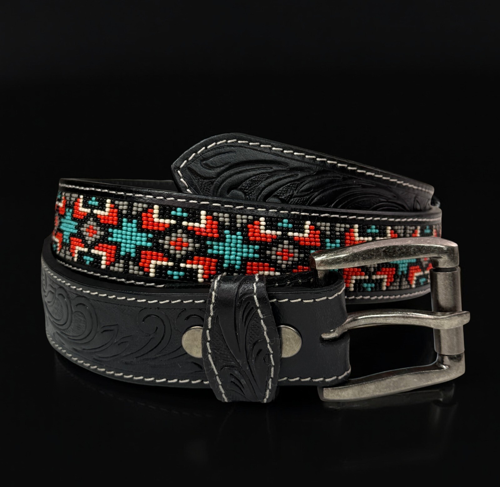 Beaded Western Belt Cowboy Rodeo Full Grain Leather Hand Tooled Removable Buckle