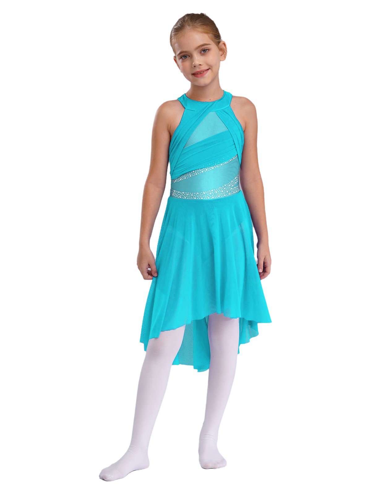 как выглядит Girls Ballet Lyrical Dance Dress Shiny Rhinestone Sleeveless High-Low Skirt фото