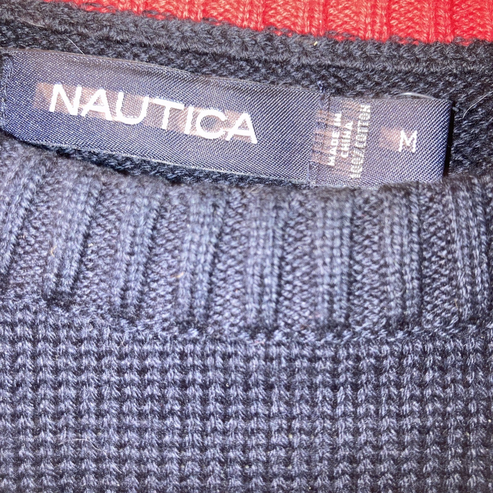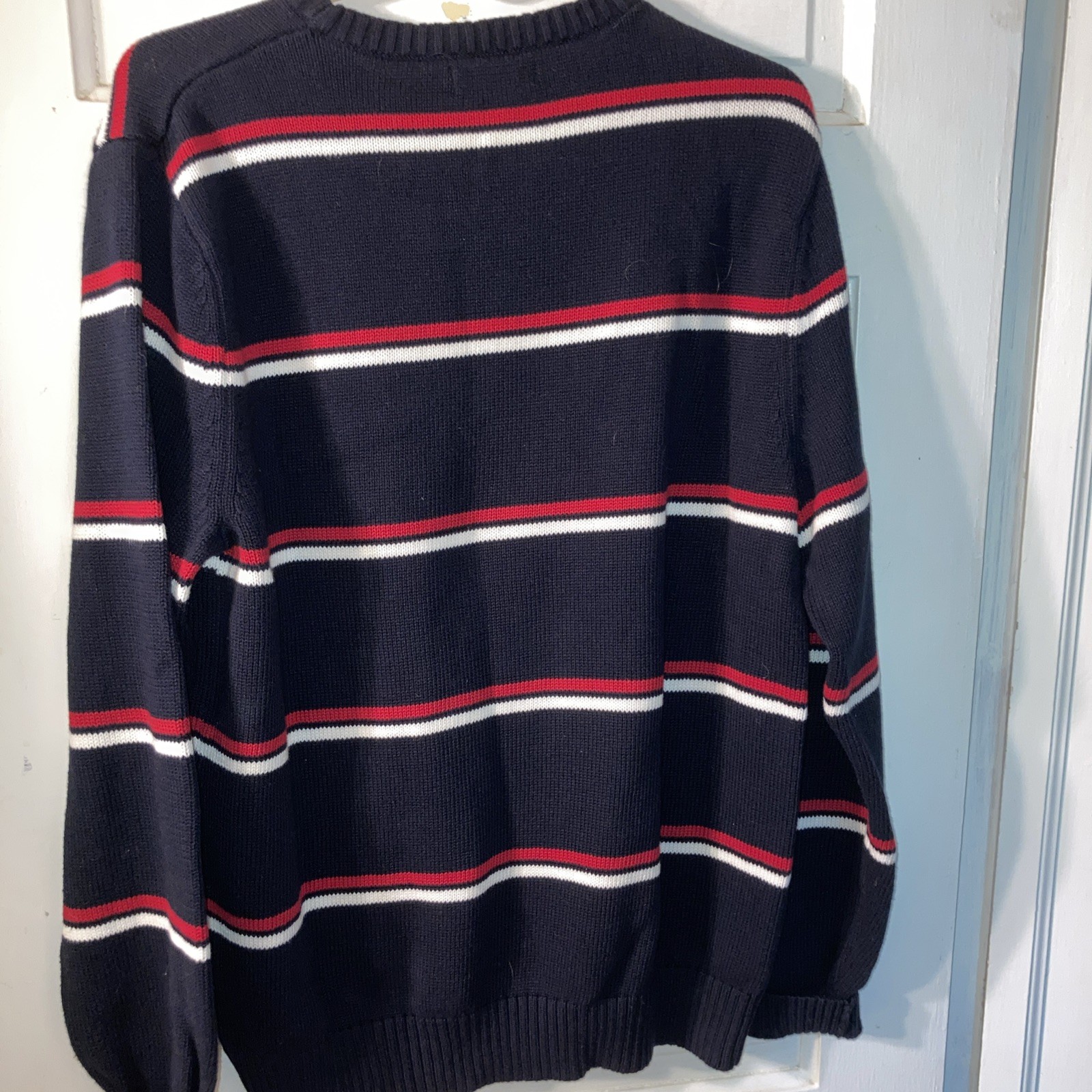 как выглядит Men s Nautica Nav Cotton Pullover Sweater Size M Red WhiteStriped Boat Logo фото