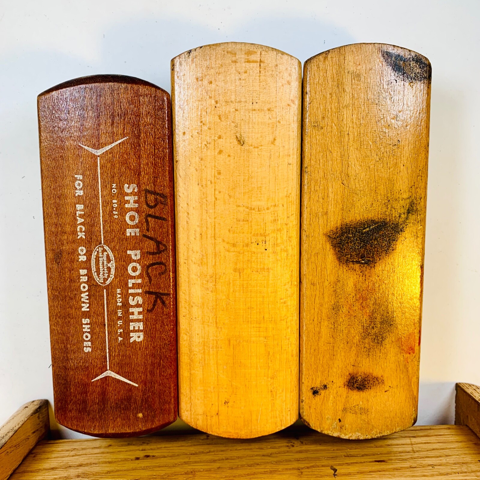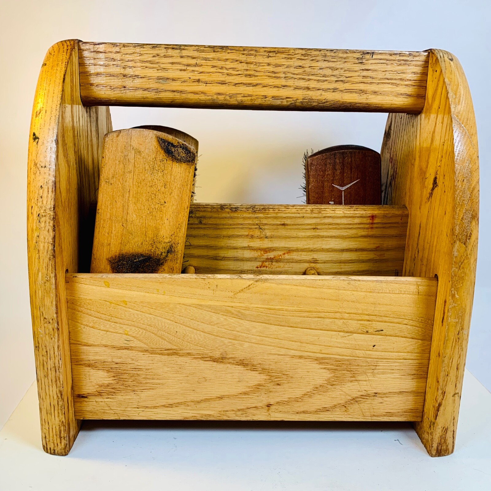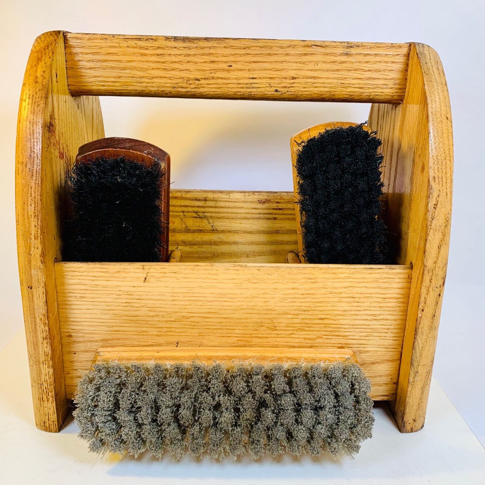 Vintage Oak Shoe Shine Kit Caddy Foot Box With 3 Vintage Brushes 1950-60 Era