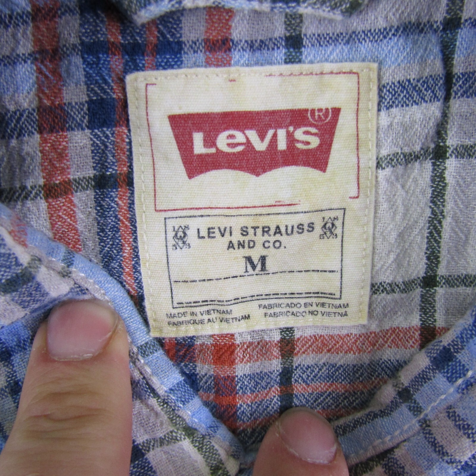 Levis Shirt Mens Medium Blue Red White Plaid Western Pearl Snap Rodeo Ranchwear