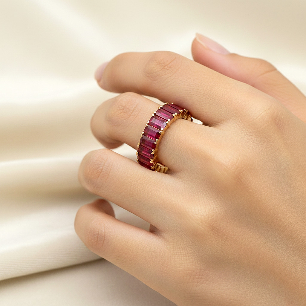 как выглядит Emerald Cut Ruby Eternity Wedding Band Ring 925 Sterling Silver, July Birthstone фото