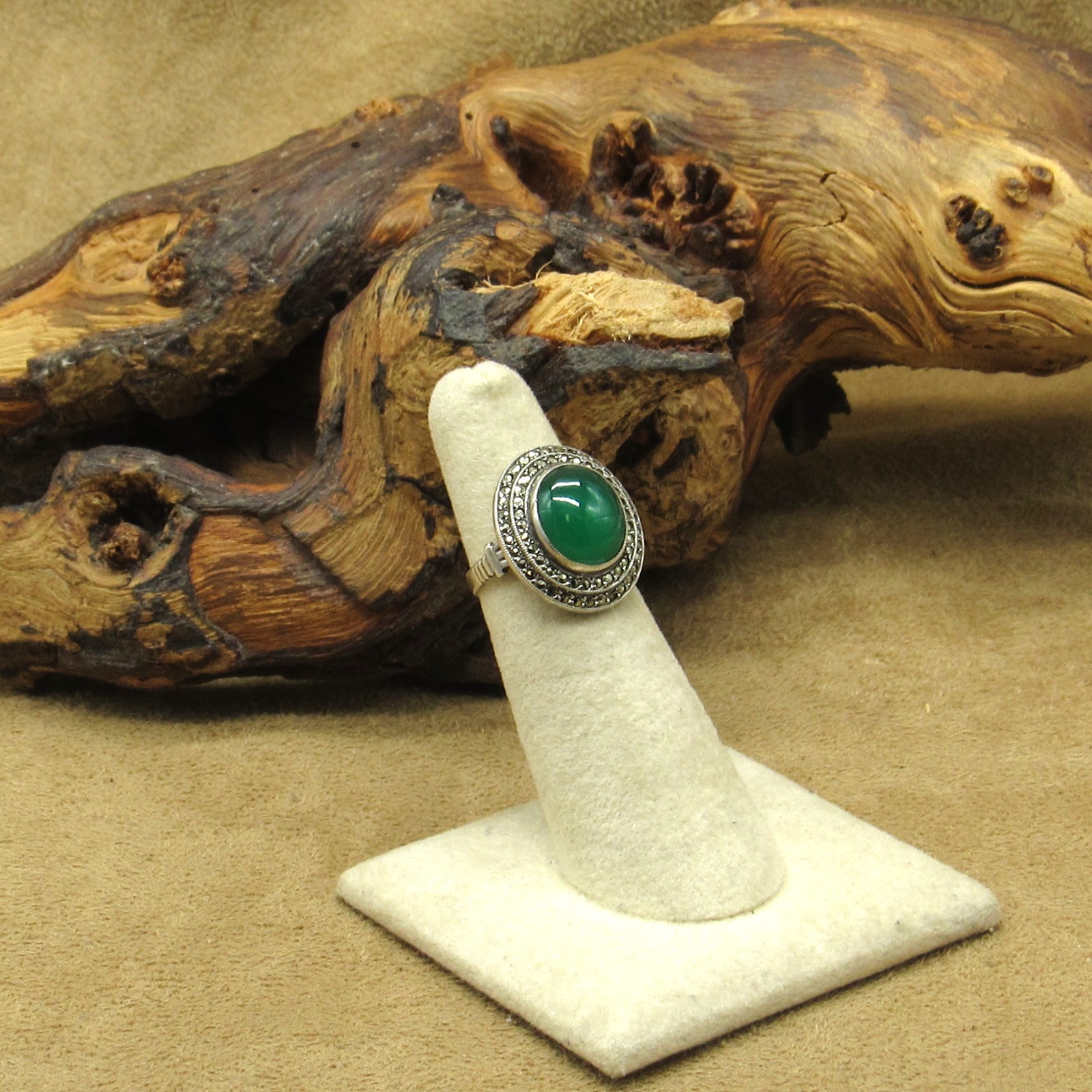 как выглядит Sterling Silver Green Stone and Marcasite Ladies Ring Size 5 фото