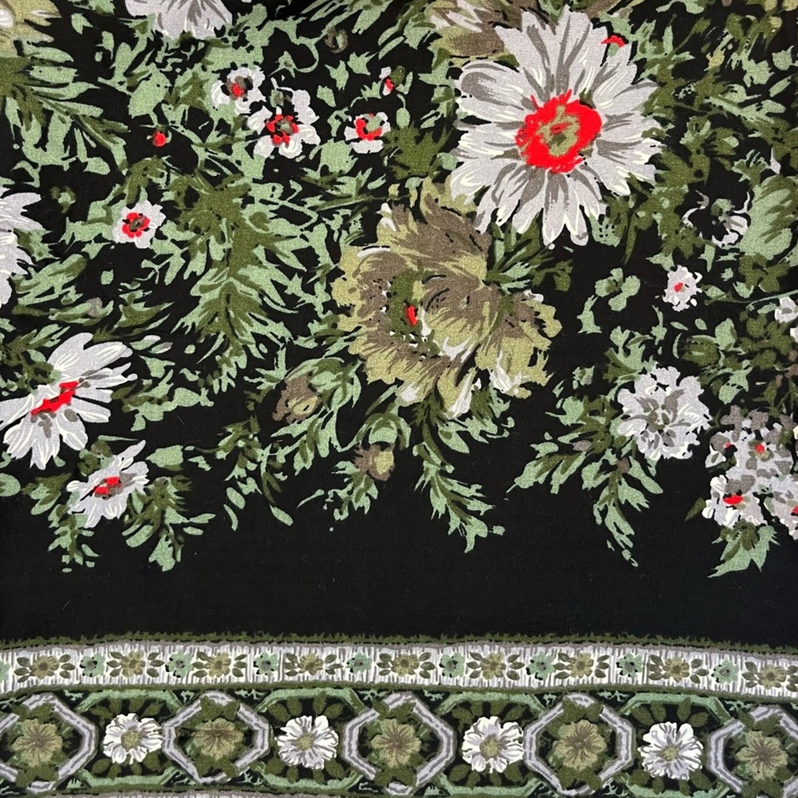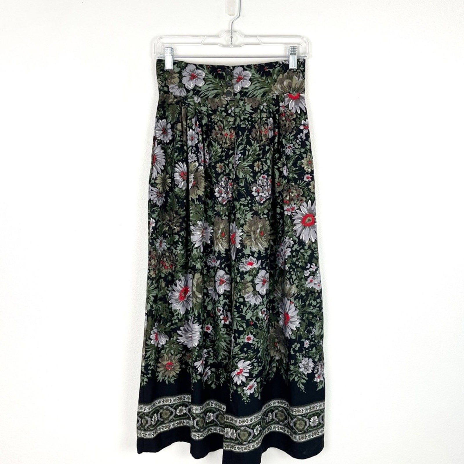 Vintage Floral Palazzo Pants Wide Leg Culotte Button Waist Pockets Black Green S