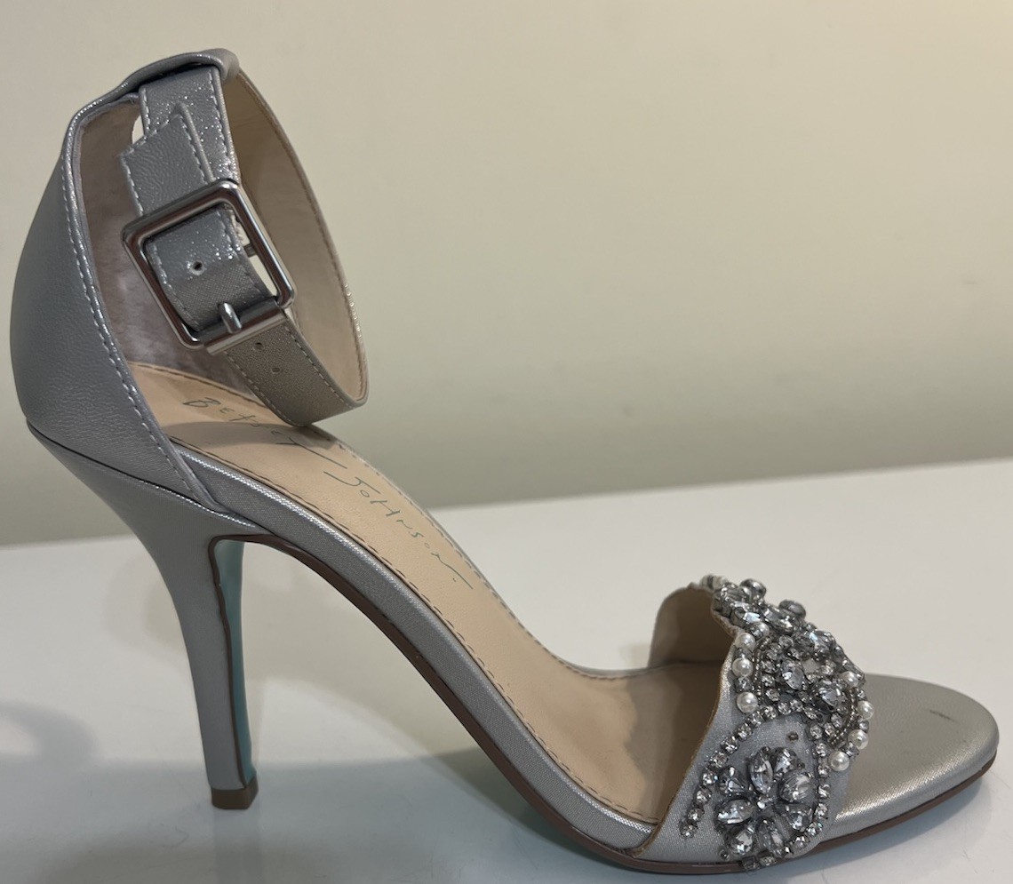 BETSEY JOHNSON Gina Shoe Stilettos Rhinestone Pearl Sandal Silver Wedding Heel 7
