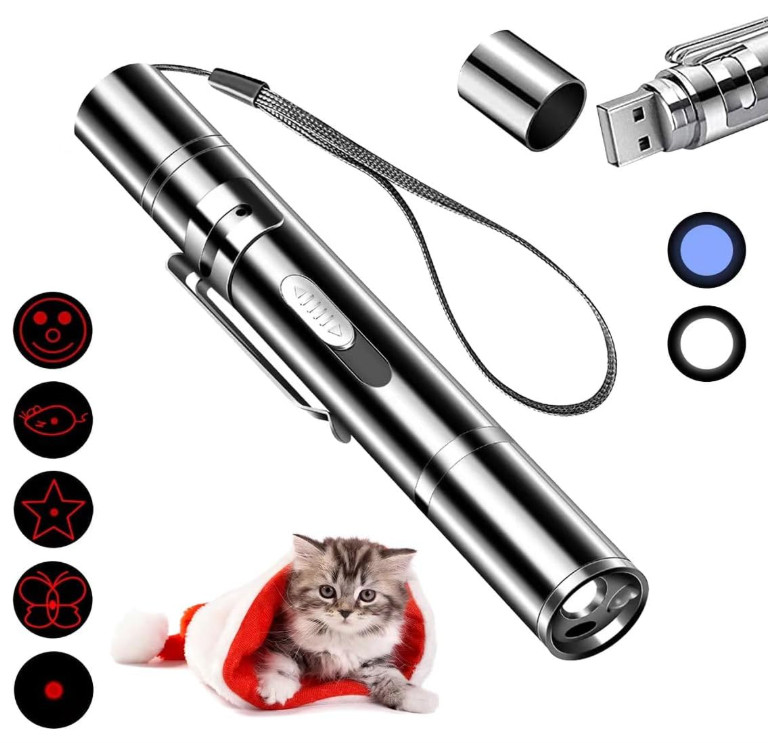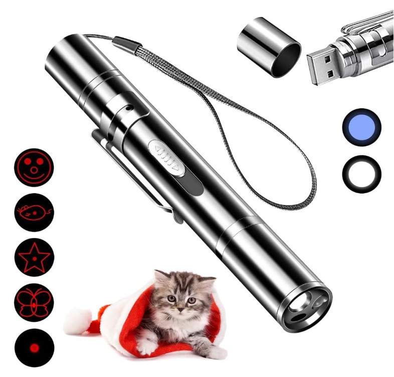 Pet Cat Laser Toy, USB Rechargeable Handheld Pointer, 5 Red Laser Patterns
