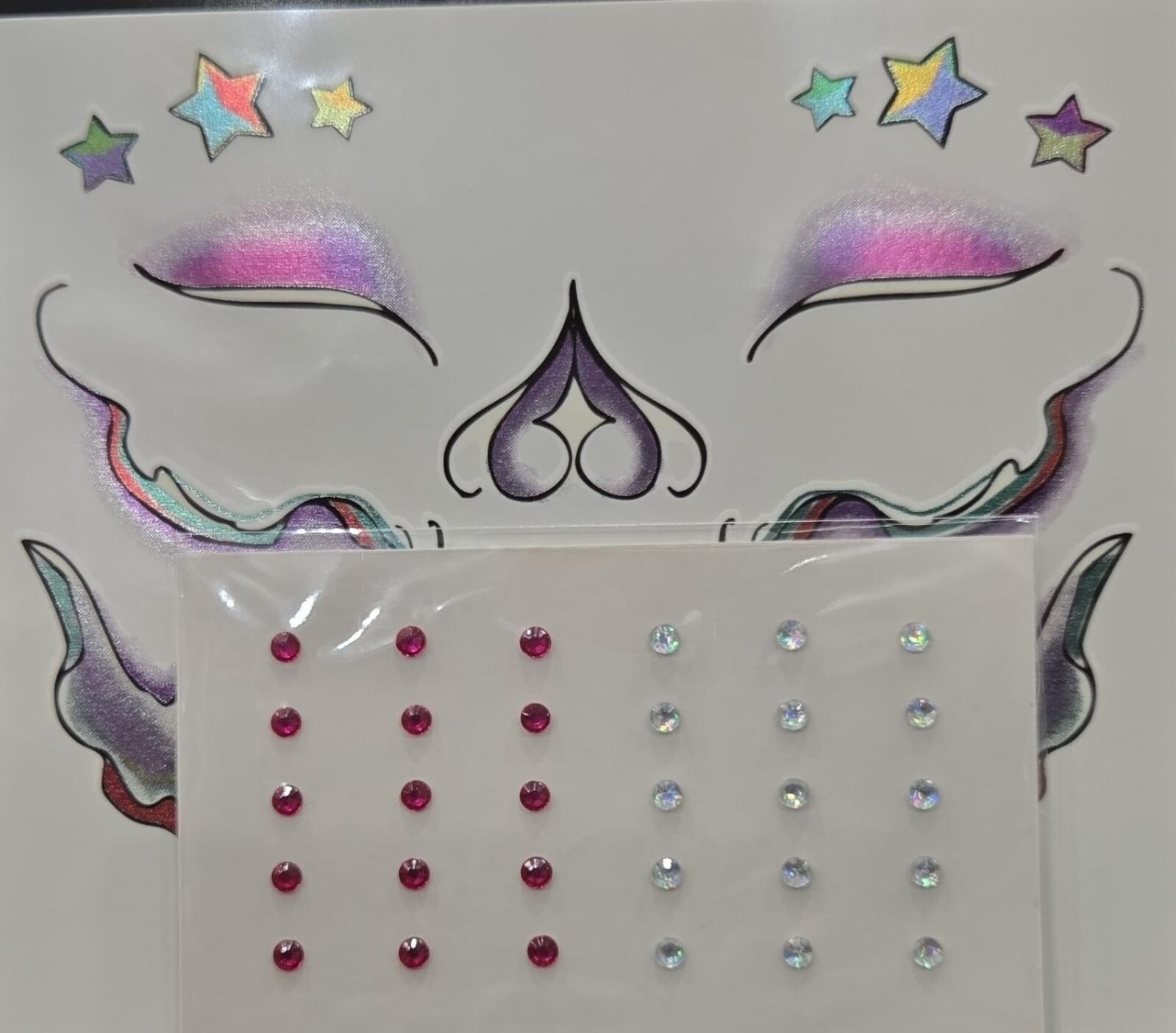 Metallic Rainbow and Stars Glam Skull Costume Face Tattoos With Gems. 2 sheets,