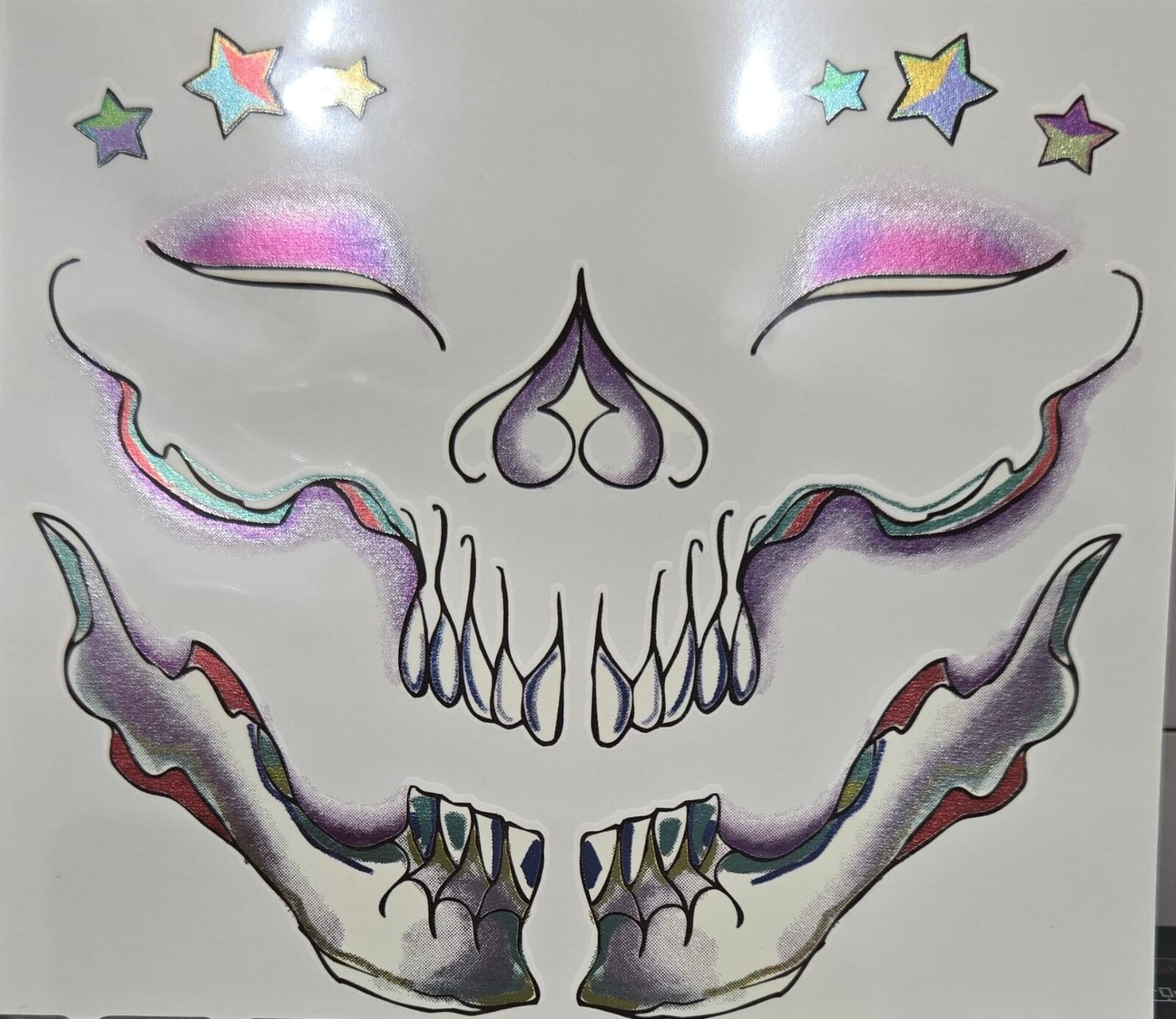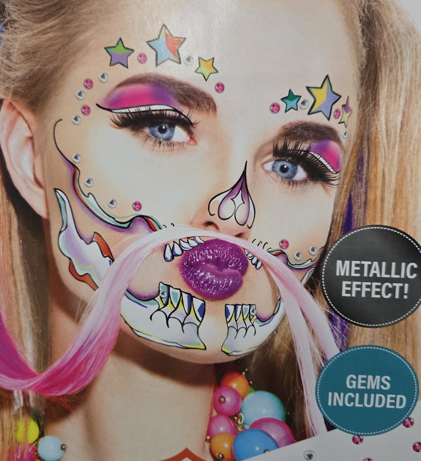 как выглядит Metallic Rainbow and Stars Glam Skull Costume Face Tattoos With Gems. 2 sheets, фото