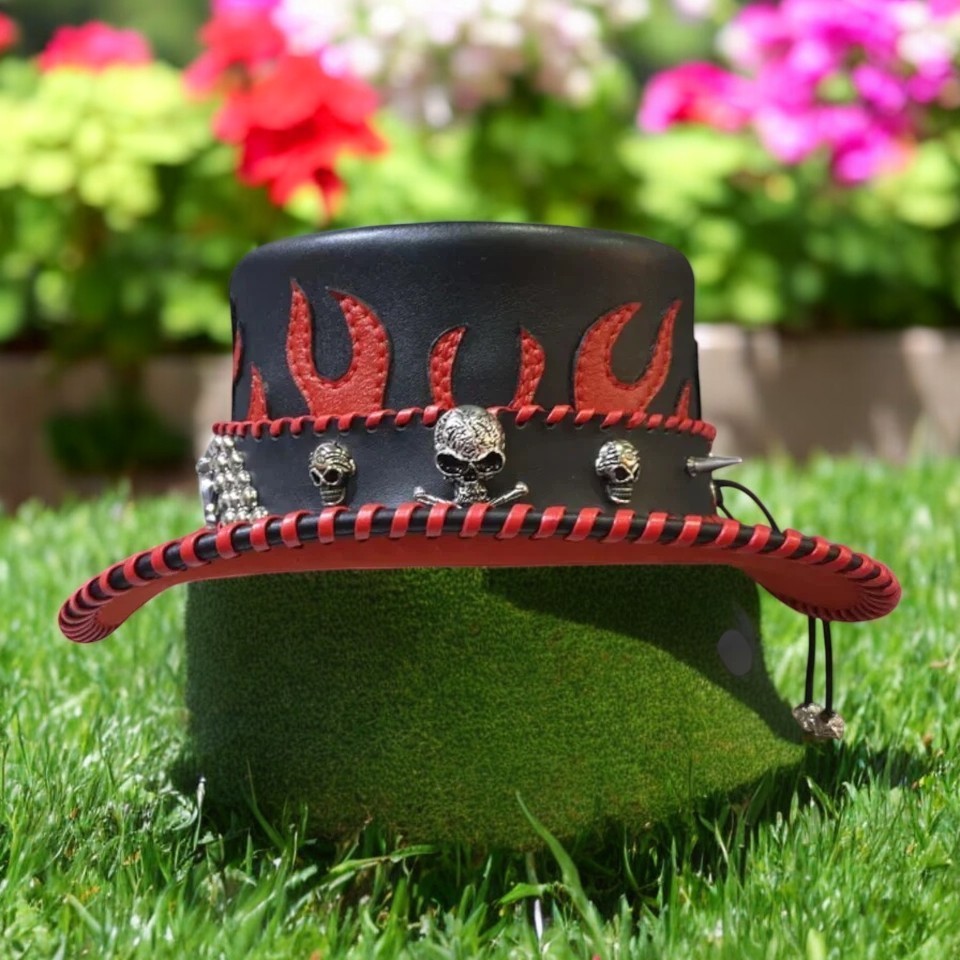 Black Leather Top Hat Red Flames Gothic Steampunk Skull Studded Hat
