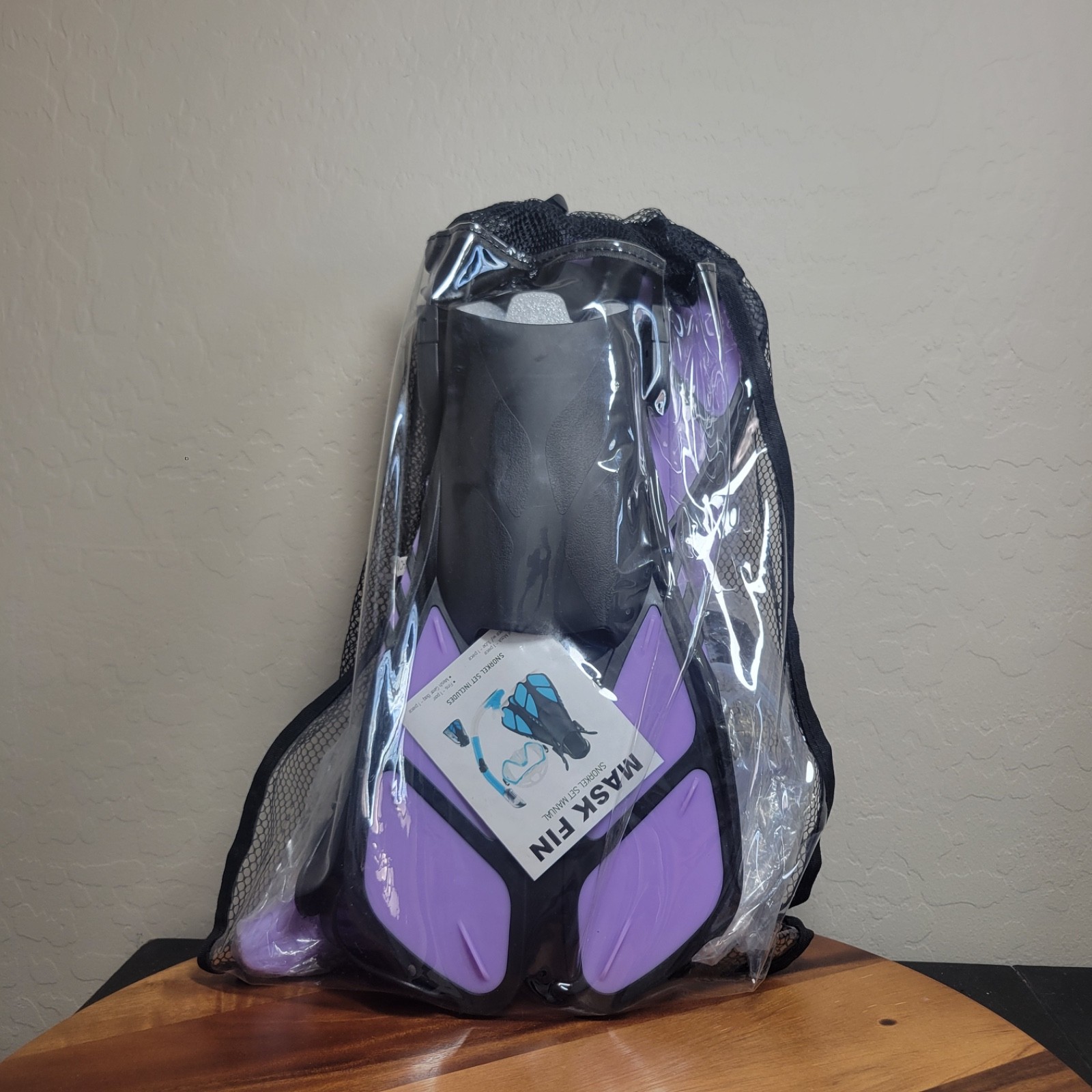 Package included: Snorkel Mask, Dry Top Snorkel, 1 Pair snorkel Fins, Mesh Bag