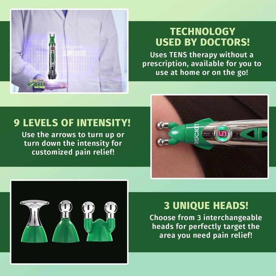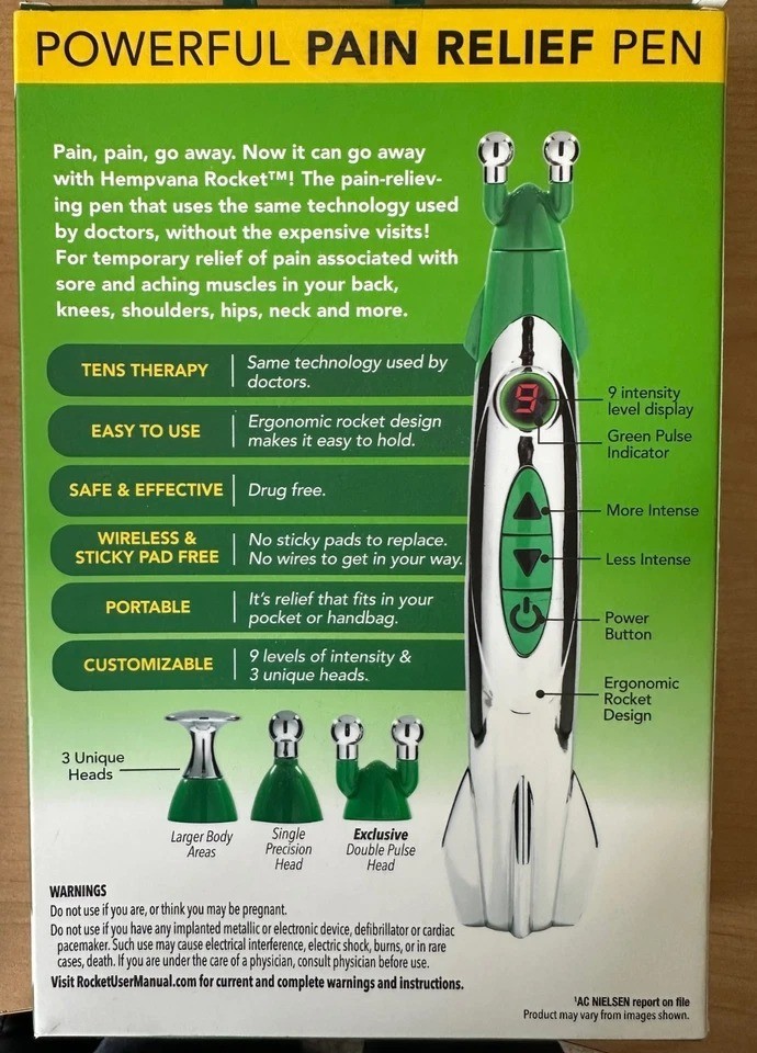 Rocket Tens Therapy Pain Relief Pen - Silver/Green - New In Box