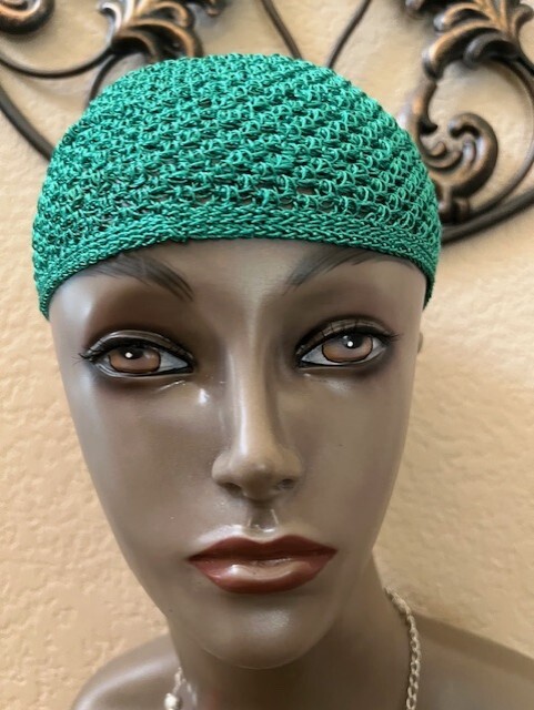 Emerald Green Knitted Hand Crocheted Stretch Cotton Kufi Hat. 21 Circumference.