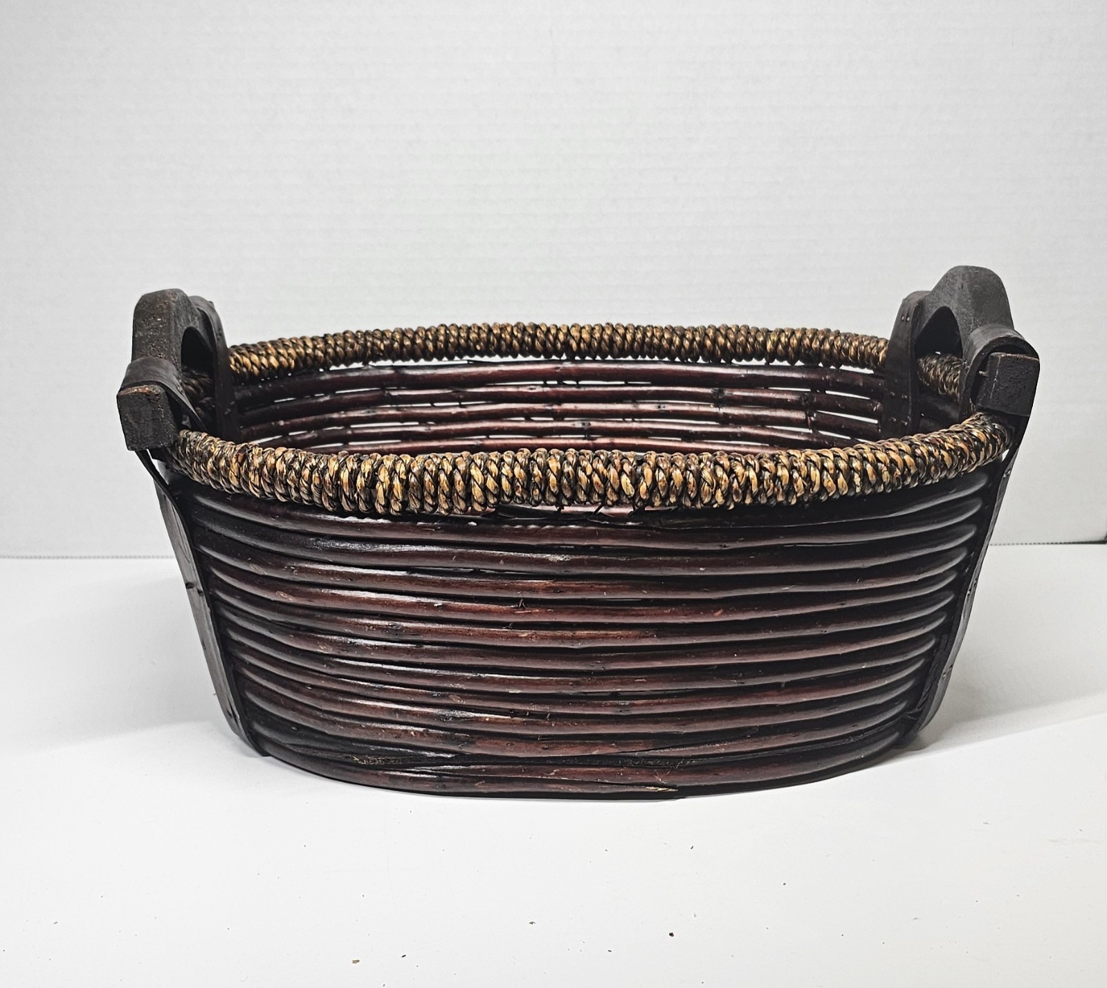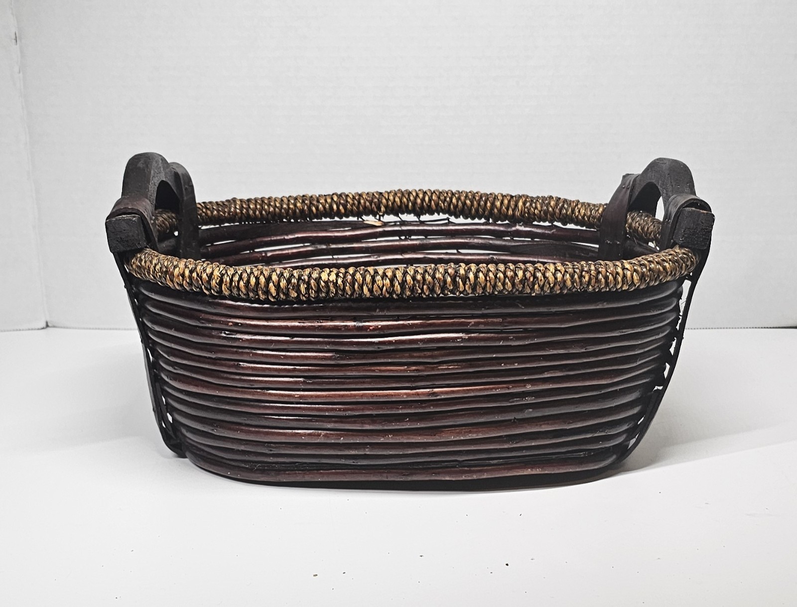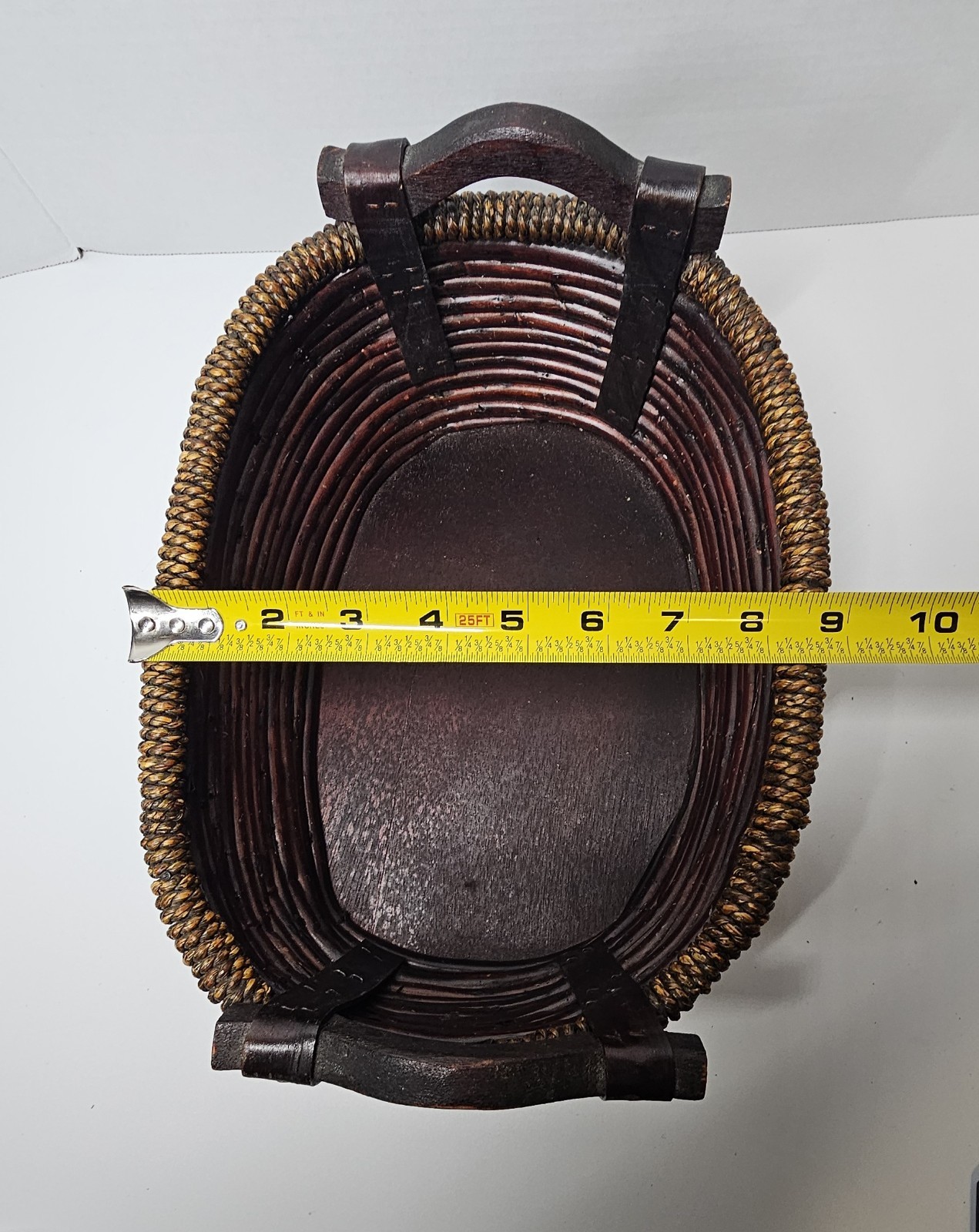 Oval Brown Rattan Bamboo Woven Basket Wood Handles Farmhouse Country Home Decor