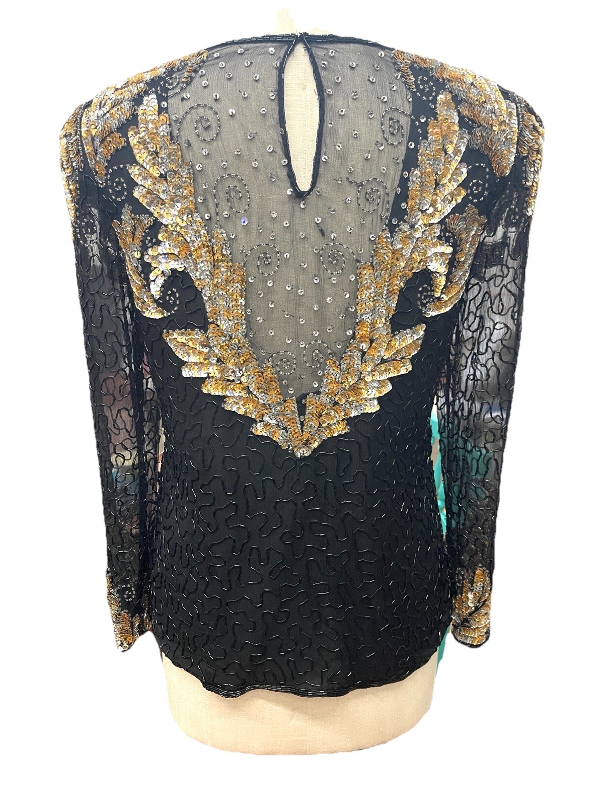 VTG 80s Stenay Top Blouse M Black Gold Silk Beads Sequins Long Sheer Sleeve