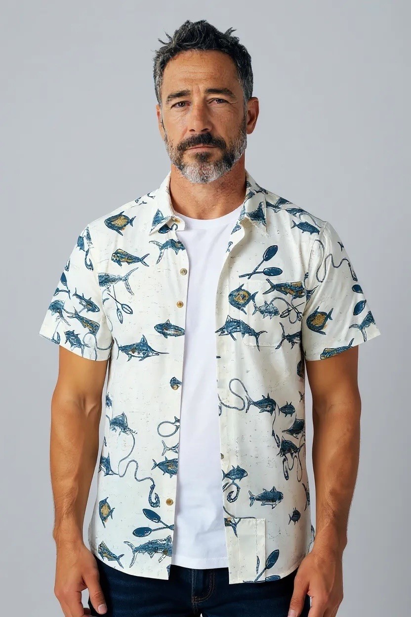NEW Mens Jack ONeill Nautical Oars Fish motif SS hawaiian camp shirt button up M