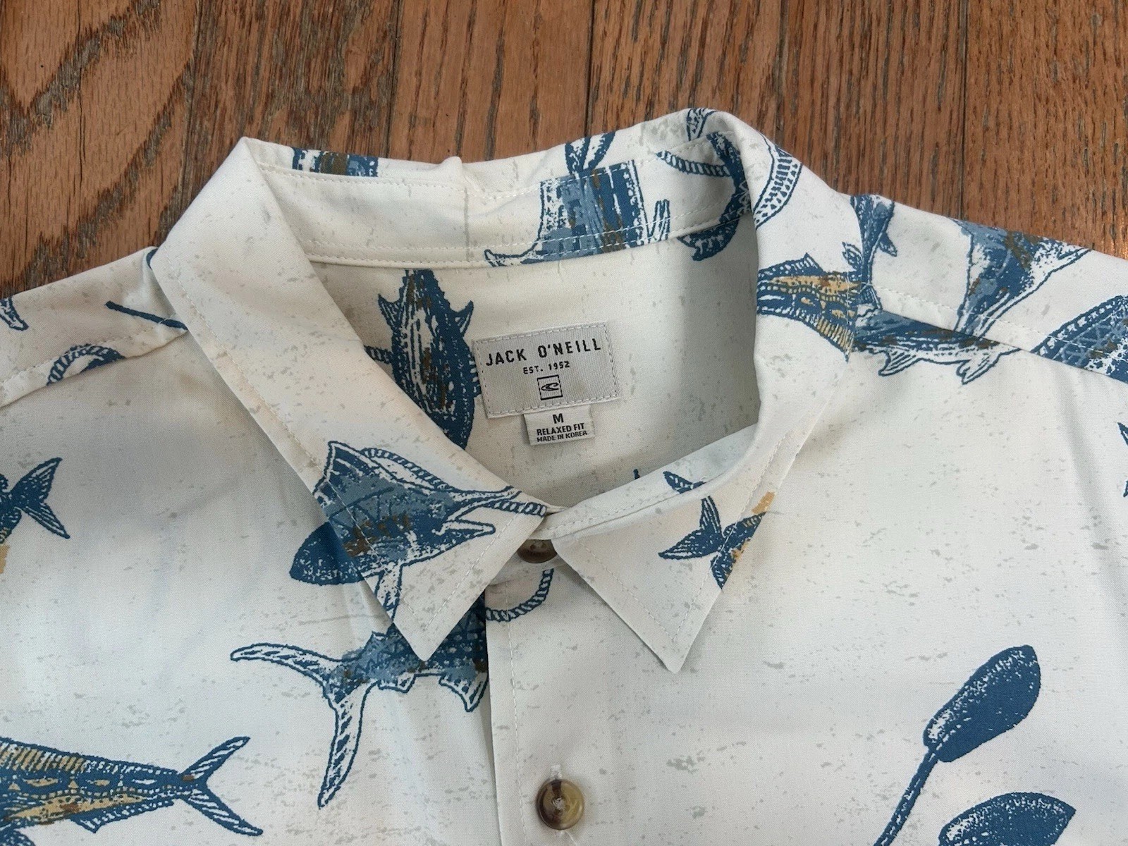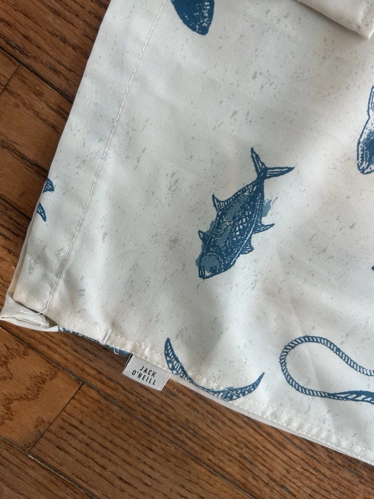 как выглядит NEW Mens Jack ONeill Nautical Oars Fish motif SS hawaiian camp shirt button up M фото