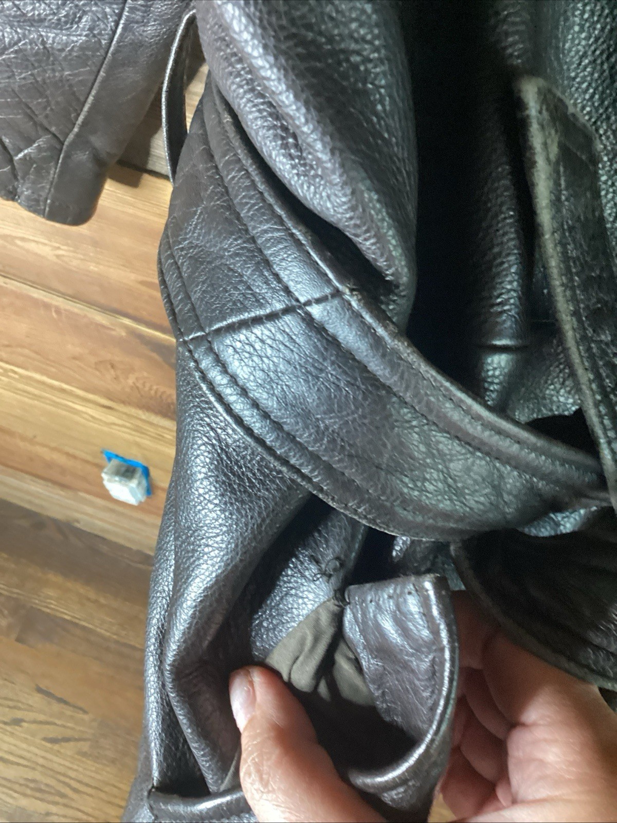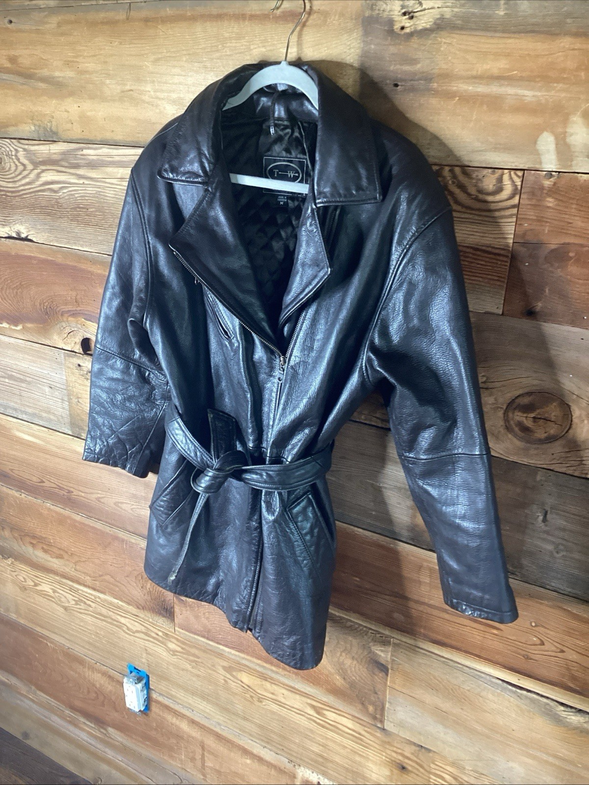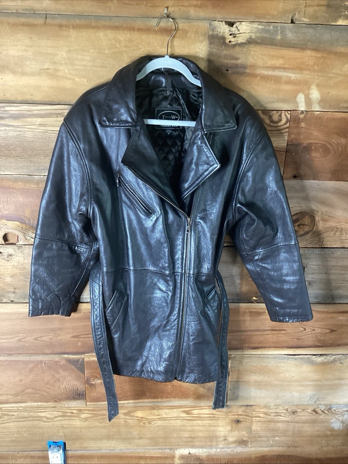 как выглядит Tannery West 90s Vintage Brown Belted Long-Line Leather Motorcycle Coat Med фото