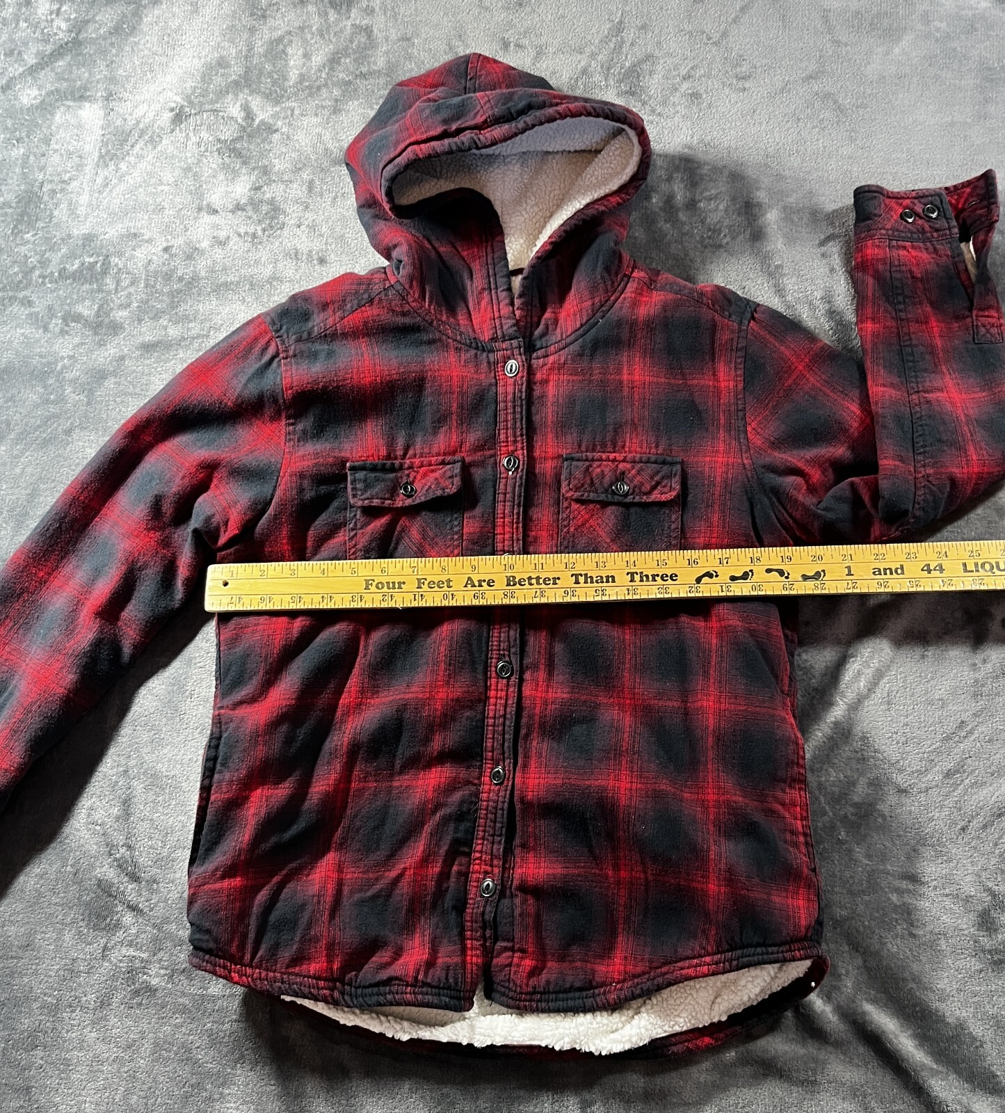 как выглядит Boston Traders Womens Red/Black Plaid Fleece-Lined Shacket Hood SIZE MEDIUM фото