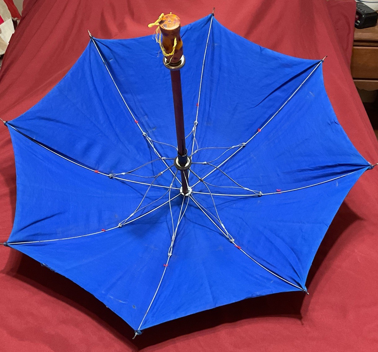 как выглядит Vintage Child s Parasol Umbrella Applique Birds Cloth Fabric Wood Handle фото