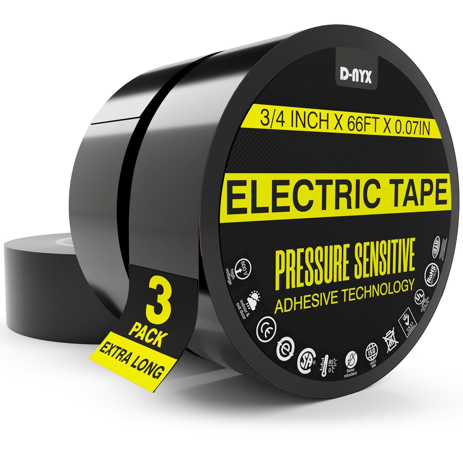 3 Pack Vinyl Electrical Tape Rolls 3/4 in x 66 ft 7 mil Black Indoor Outdoor