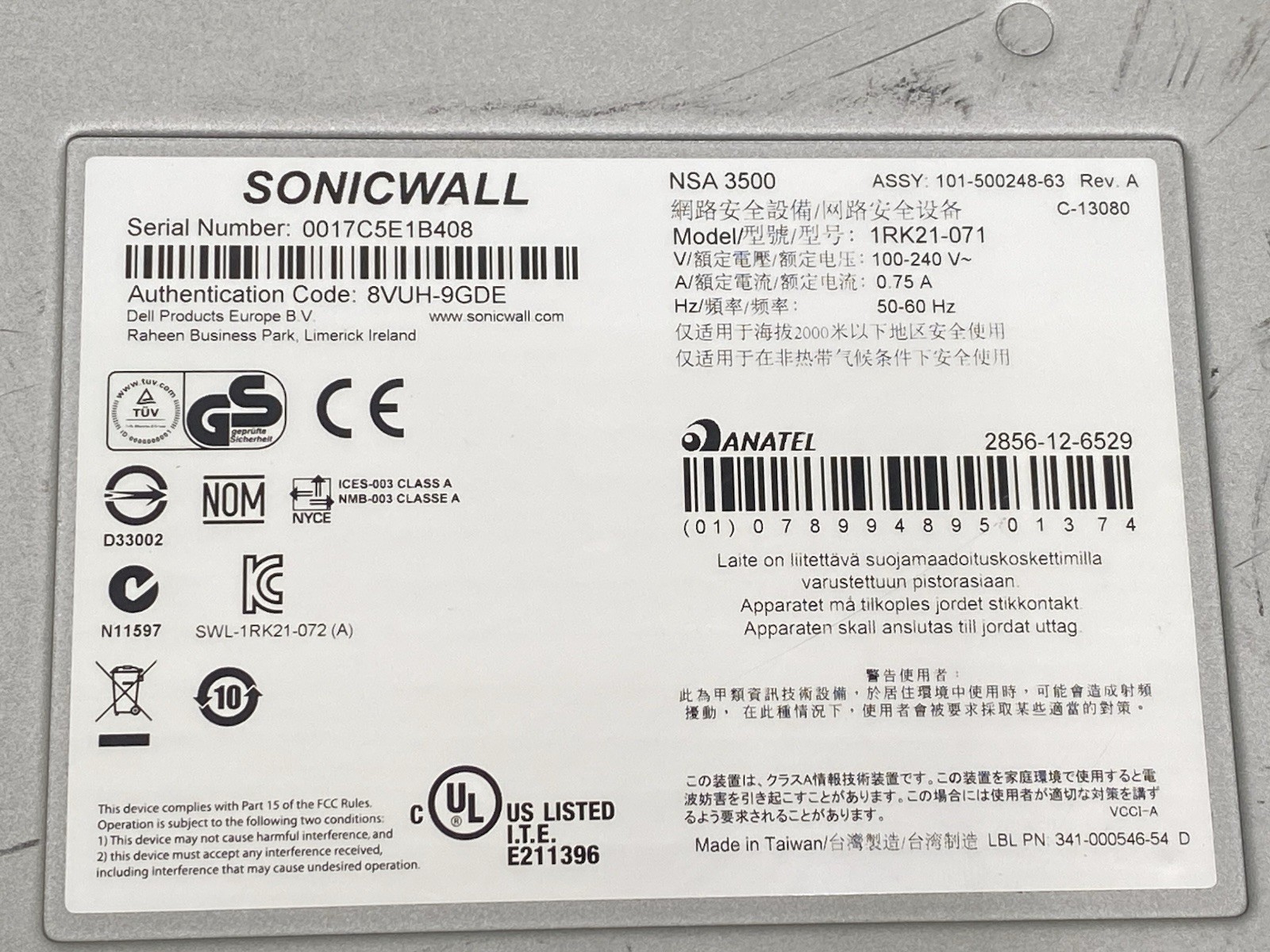 SonicWALL NSA 3500 1RK21-071 Network Security Appliance Firewall w/ Rack Ears