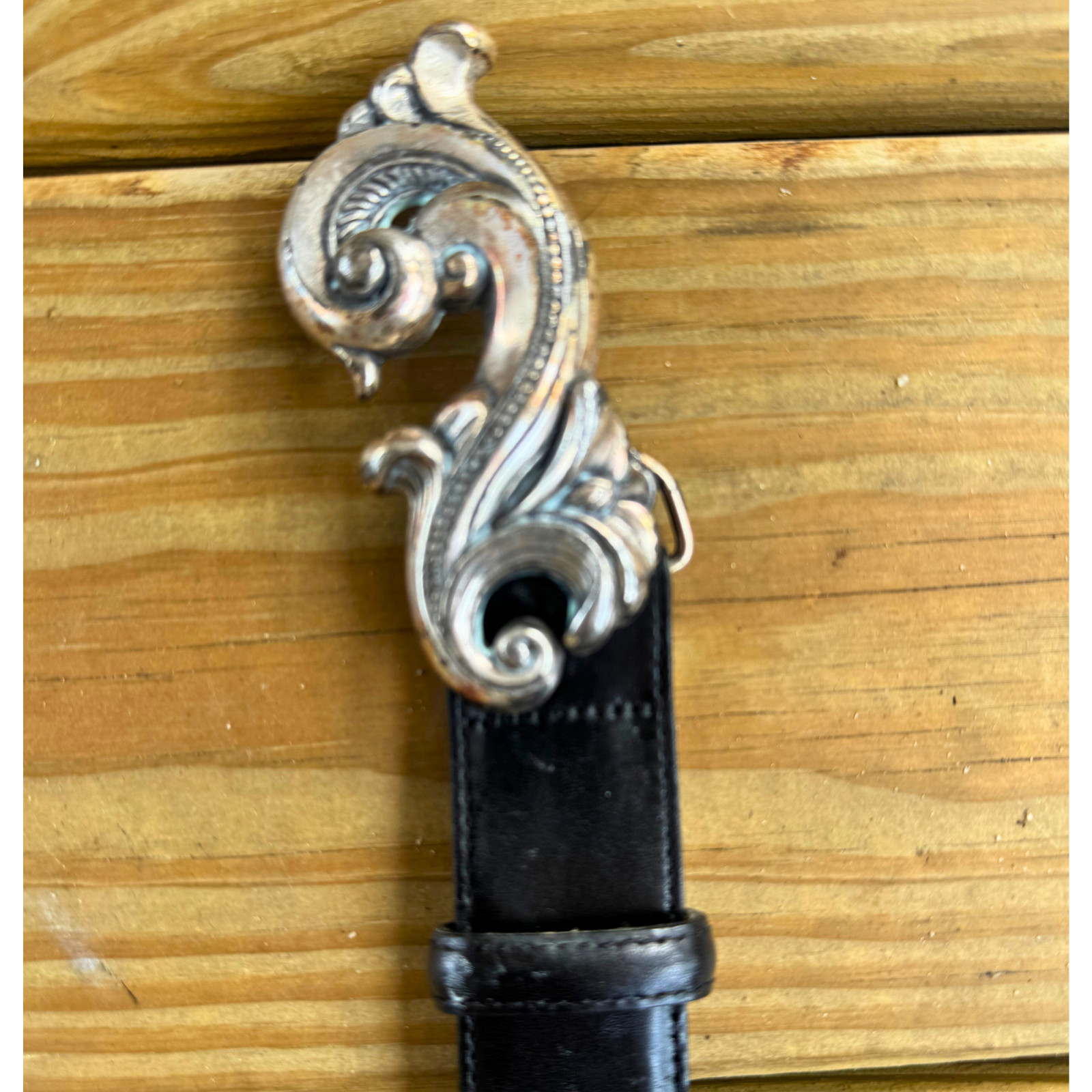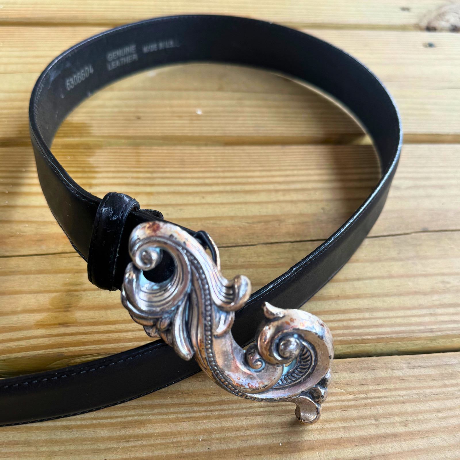 как выглядит Vintage Black Leather Belt Made in USA Silver Ornate Scroll Buckle Size Large фото