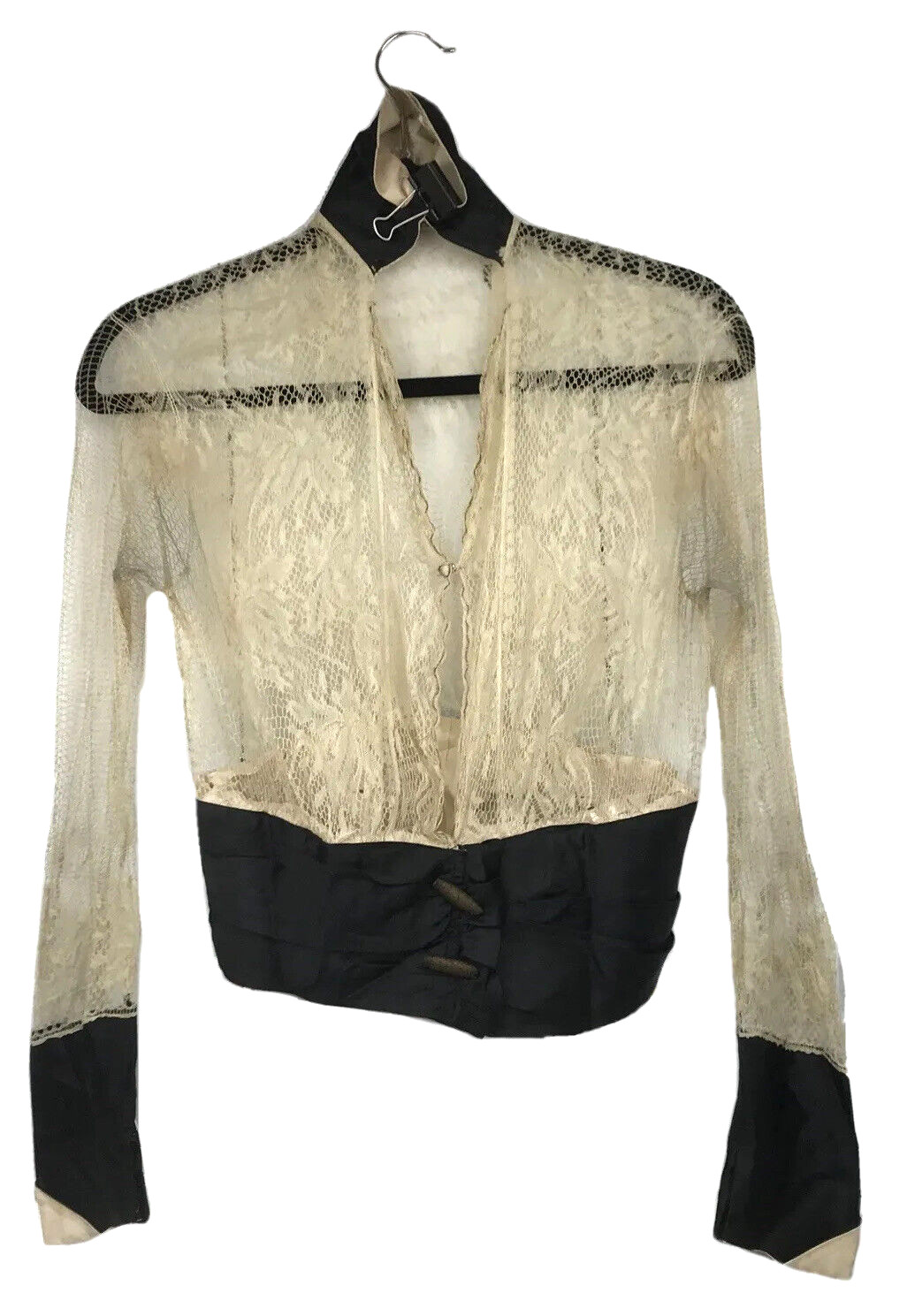 Antique Victorian Womens Lace Silk Bodice Top Blouse High Collar Black Cream