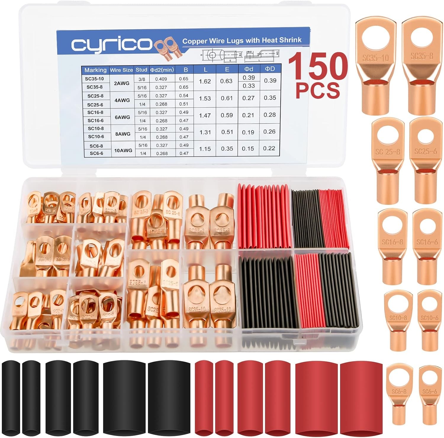 Copper Battery Cable Ends Wire Lugs Assortment Kit AWG2 4 6 8 10 Gauge 150pcs...