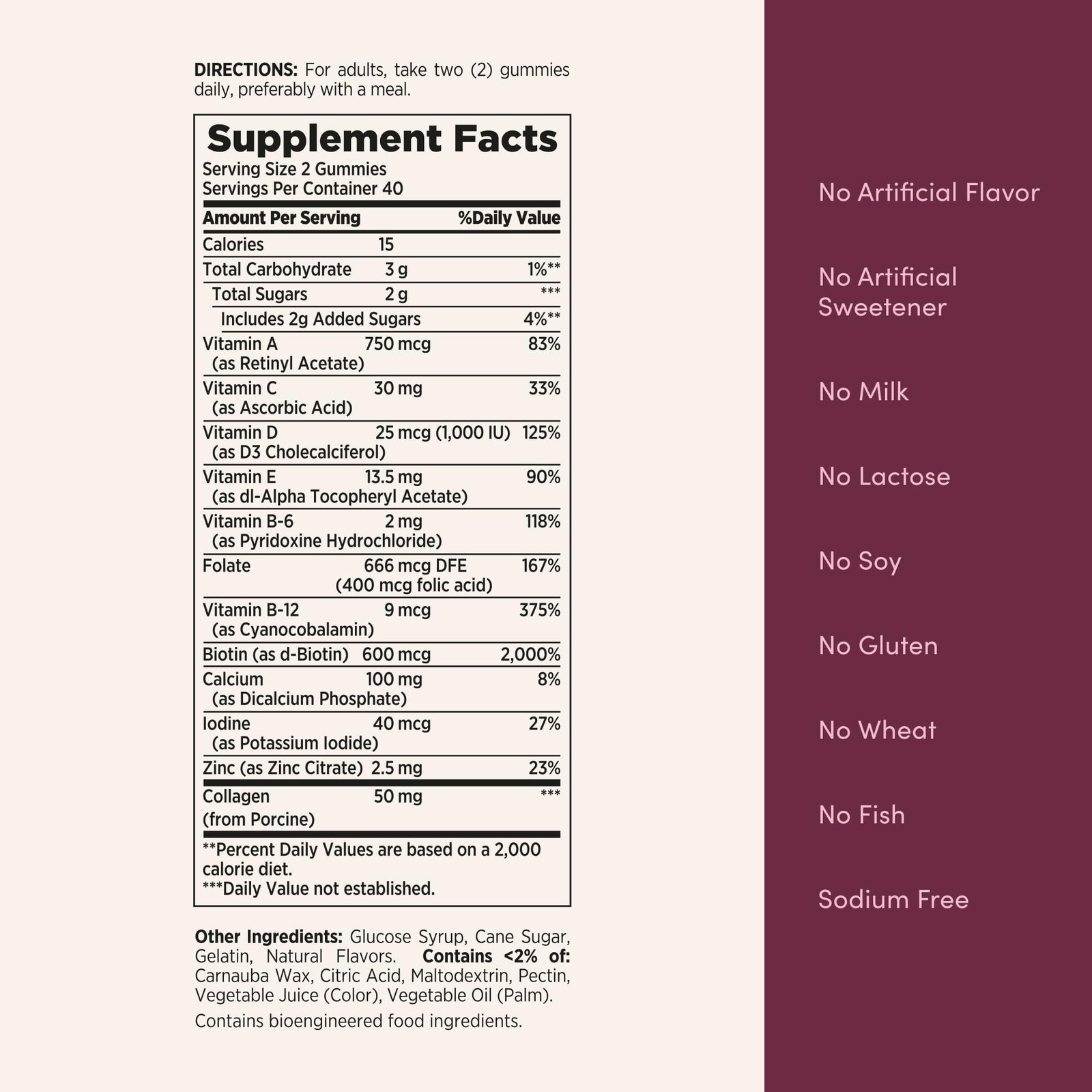 Active Ingredients: Folic Acid, Calcium, Biotin, Vitamin B12, Zinc, Vitamin A, Vitamin B5 (Pantothenic Acid), Vitamin D, Vitamin E, Vitamin B, Collagen, Raspberry, Vitamin B6