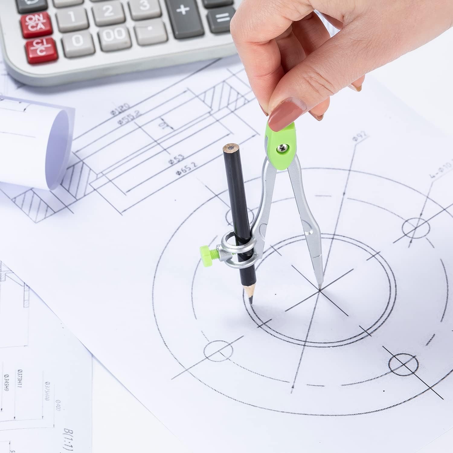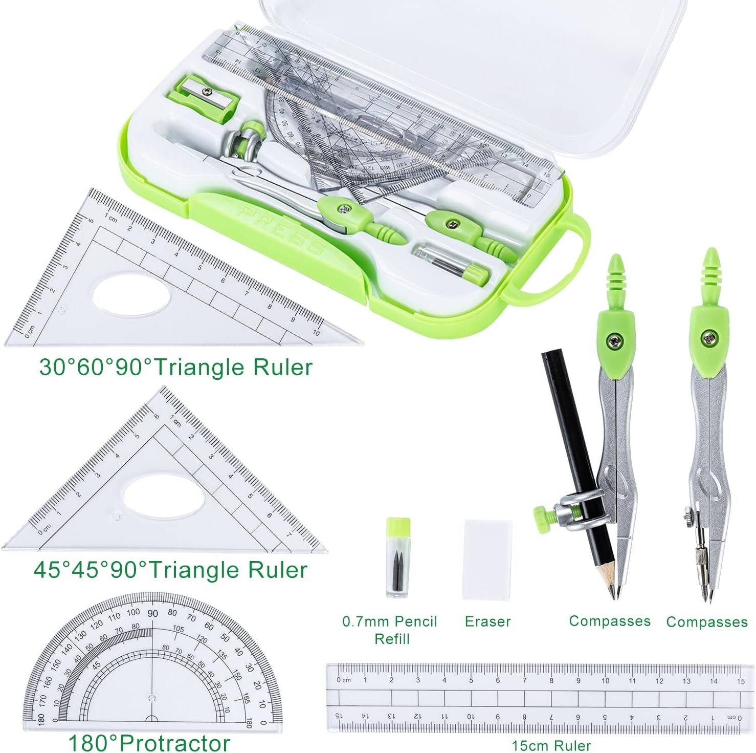 10 Pieces Math Geometry Kit Set with Shatterproof Storage Box, Student Green