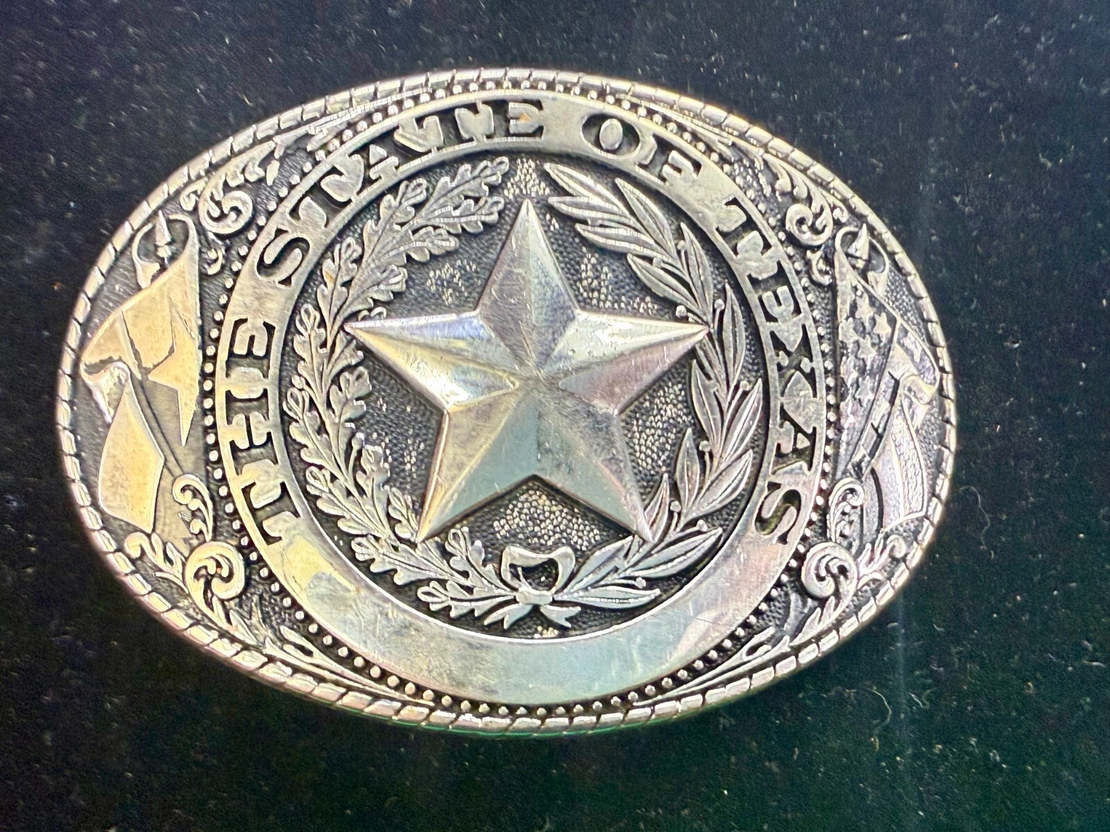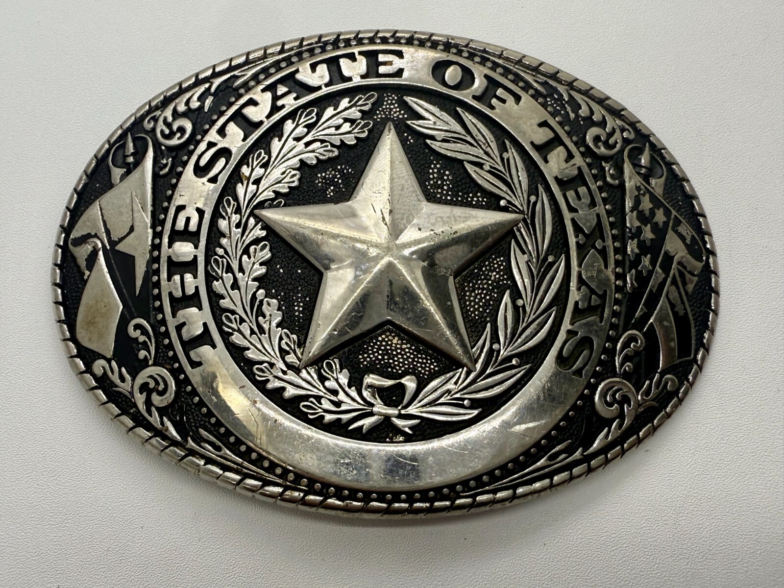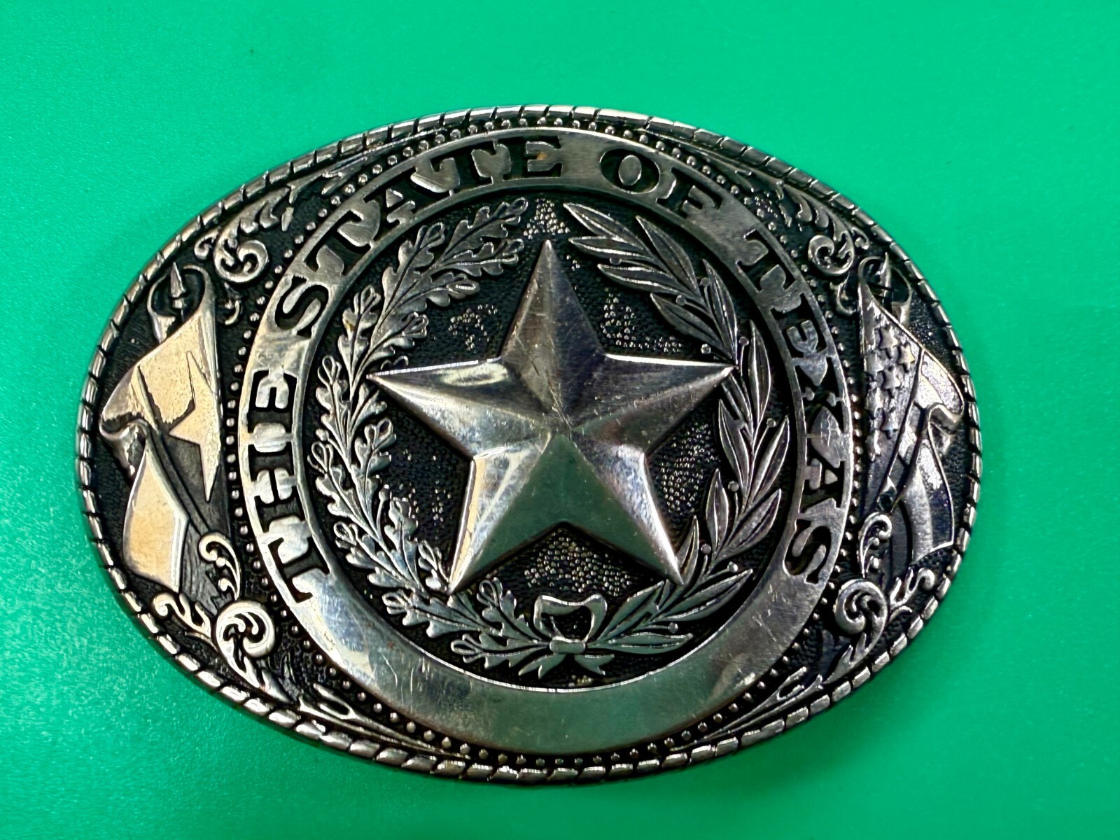 The Great State Of Texas LONE STAR Flag Olive Branch Silver Color Belt Buckle