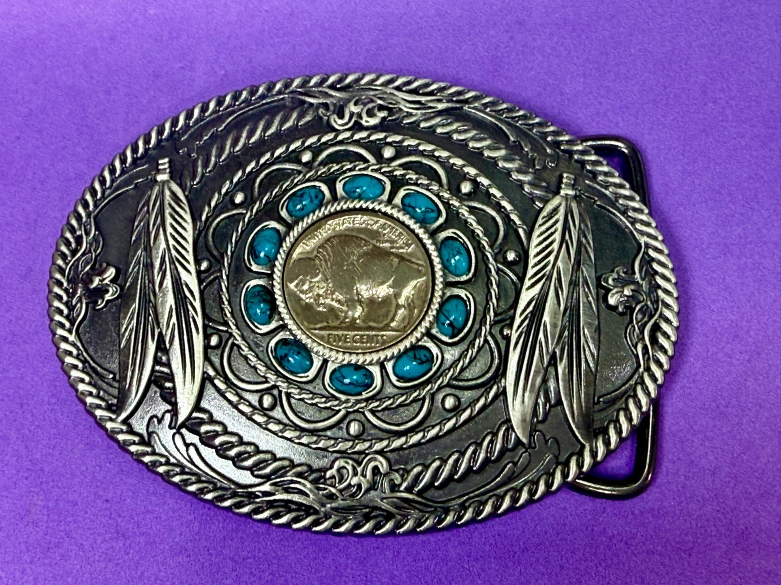 • Buffalo Nickel Turquoise Stone Feather Native American Themed Vtg. Belt Buckle