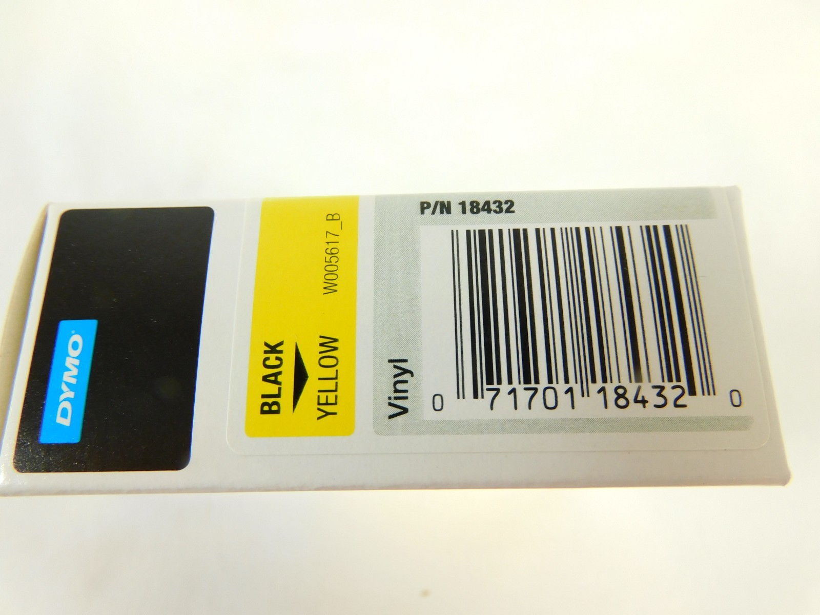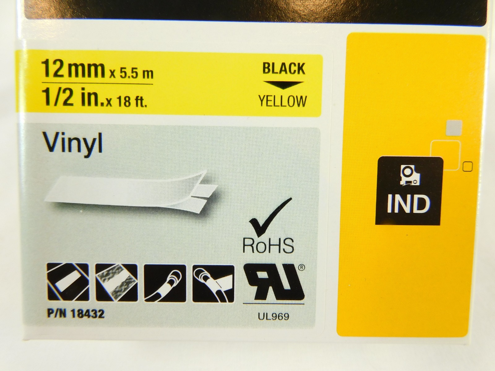 Dymo Rhino 18432 Yellow Vinyl Tape 1/2 Black Text on Yellow - 18 Feet