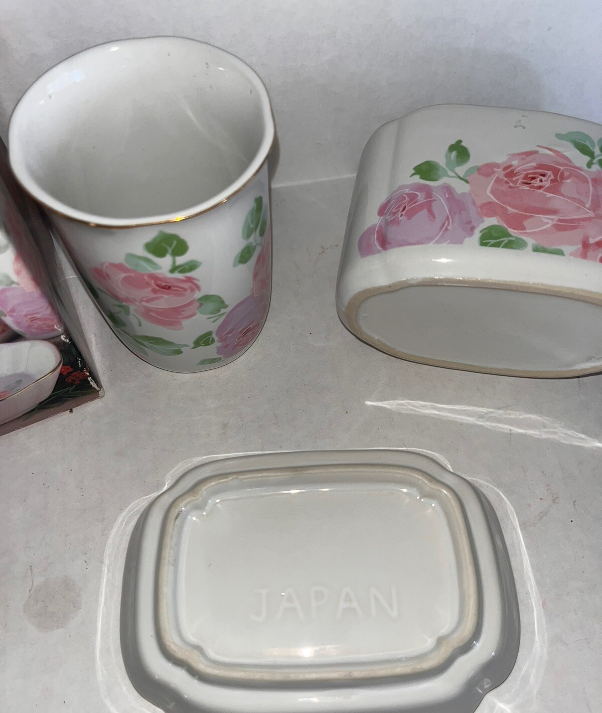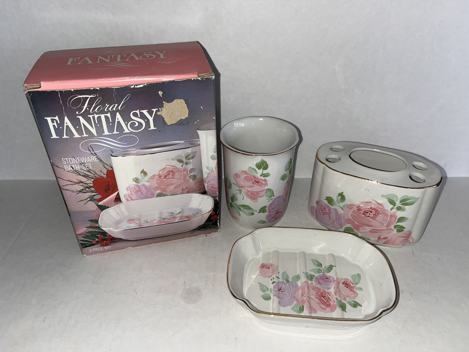 • Vintage Floral Bath Vanity Set Pink White Floral By Floral Fantasy Stoneware Set