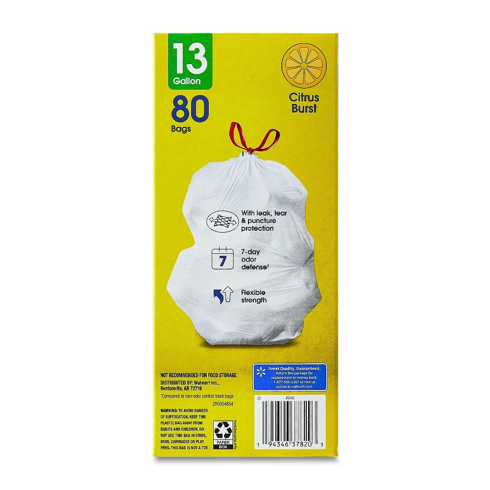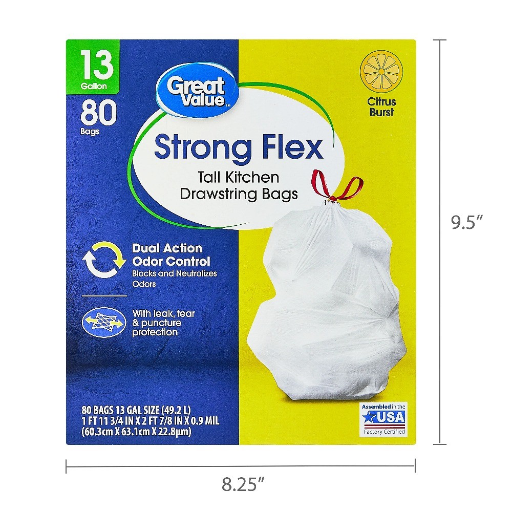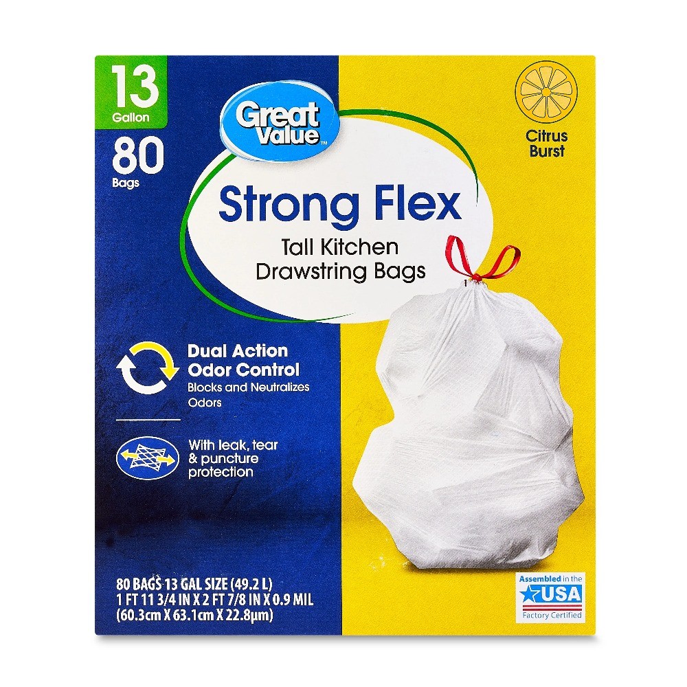 Great Value Strong Flex 13-Gallon Drawstring Tall Kitchen Trash Bags, 80 Count