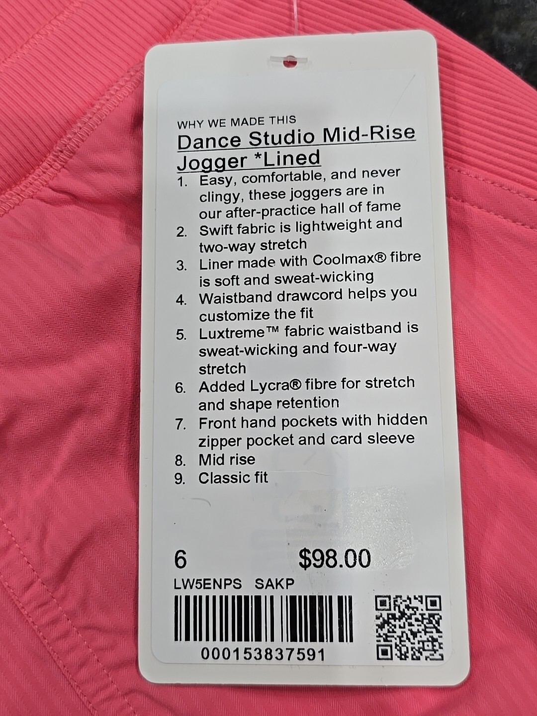 Lululemon Dance Studio MR Jogger LINED Pant size 6 Regular Sakura Pink