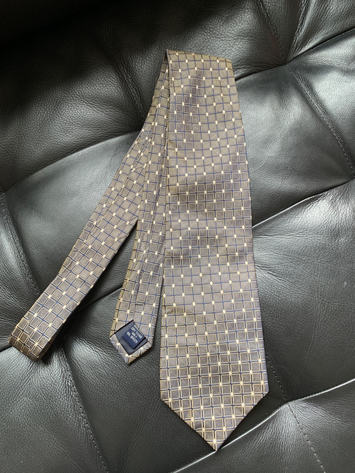 Versa Silk Tie Necktie Tan w/Blue Dots Squares 3.75x57 Handmade