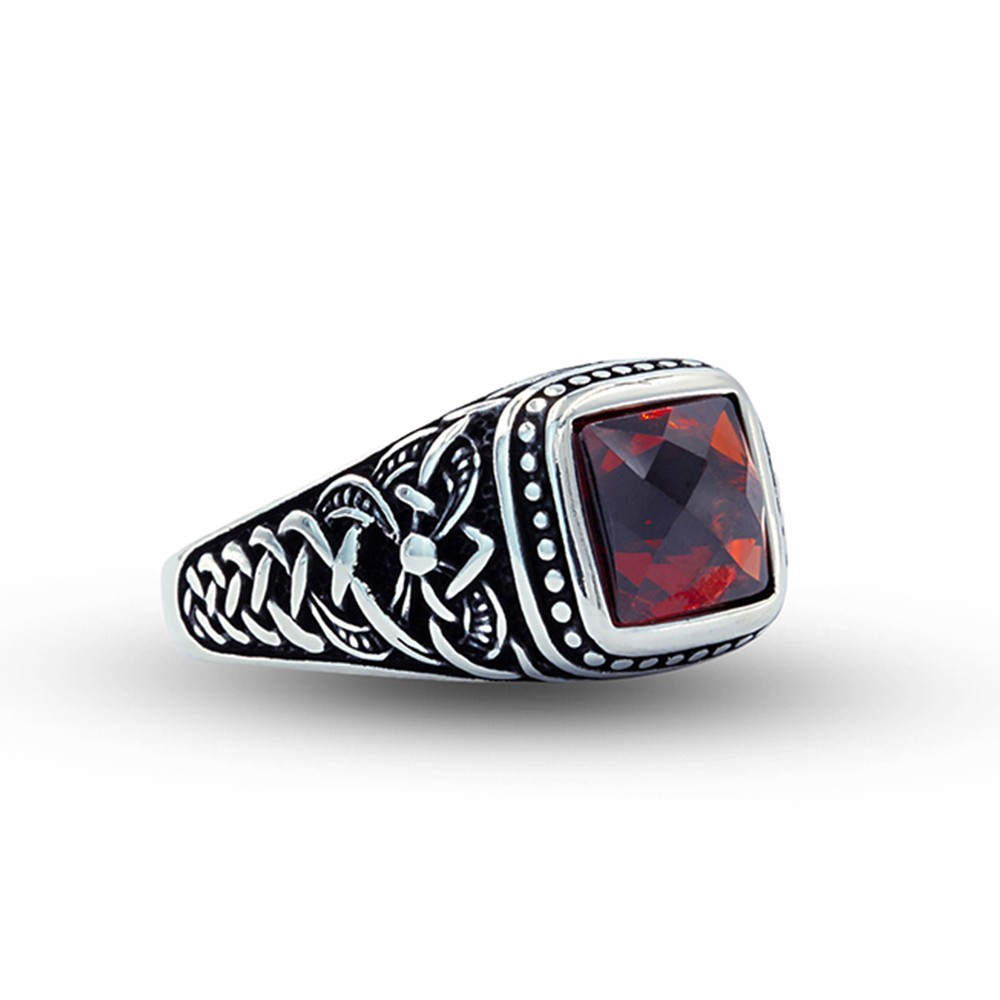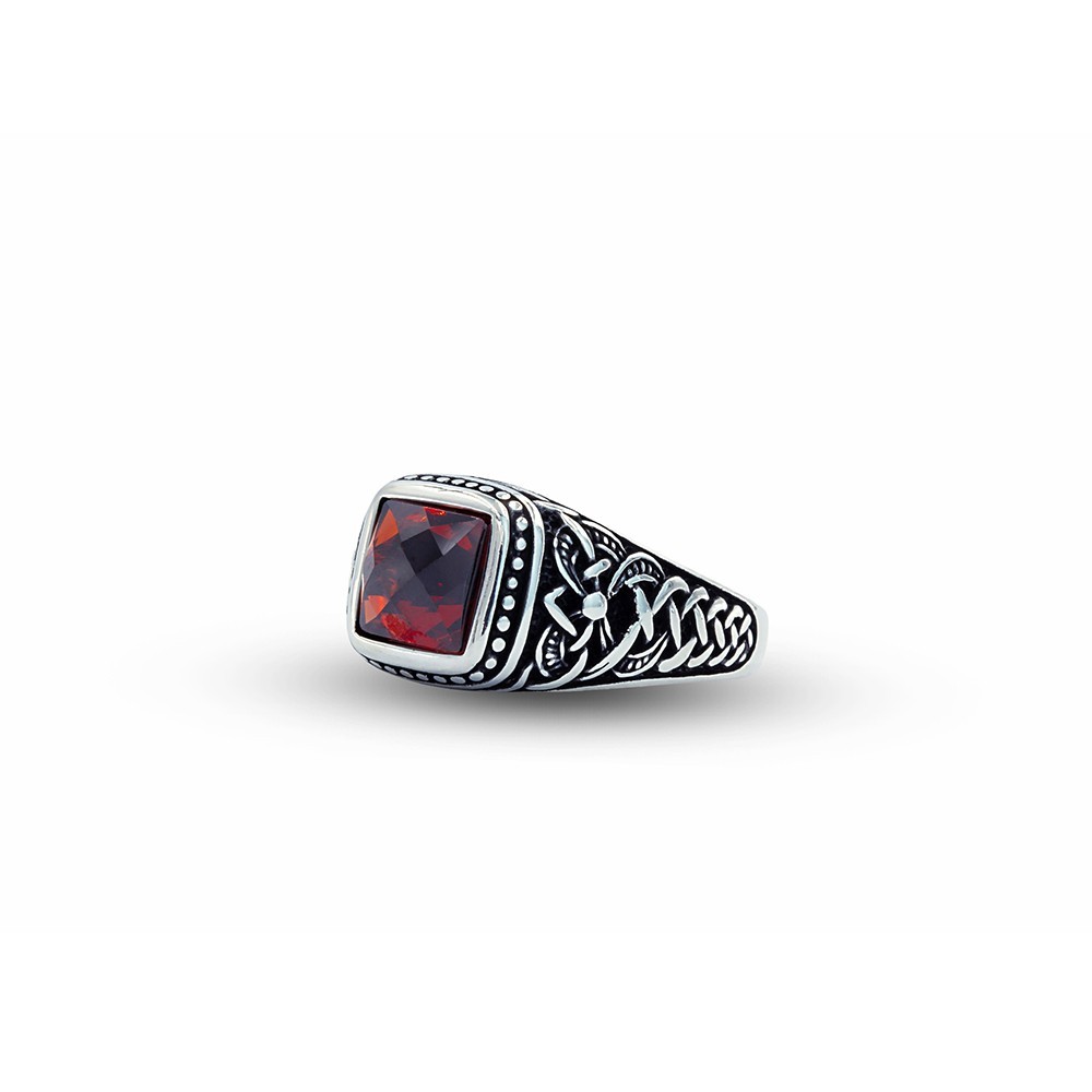 Handmade Engraved 925 Sterling Silver Red Garnet Gemstone Men's Ring