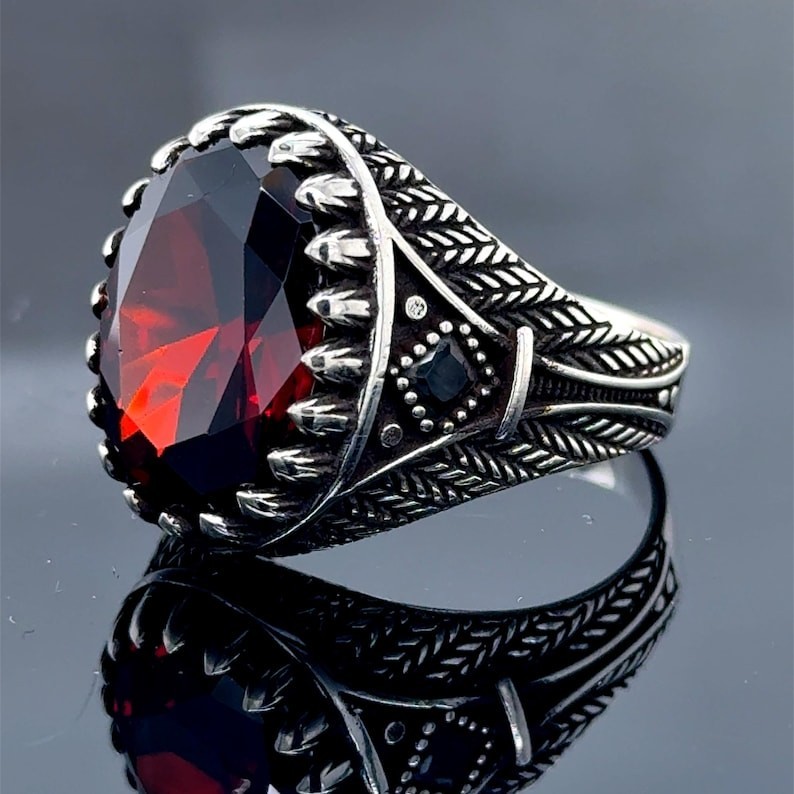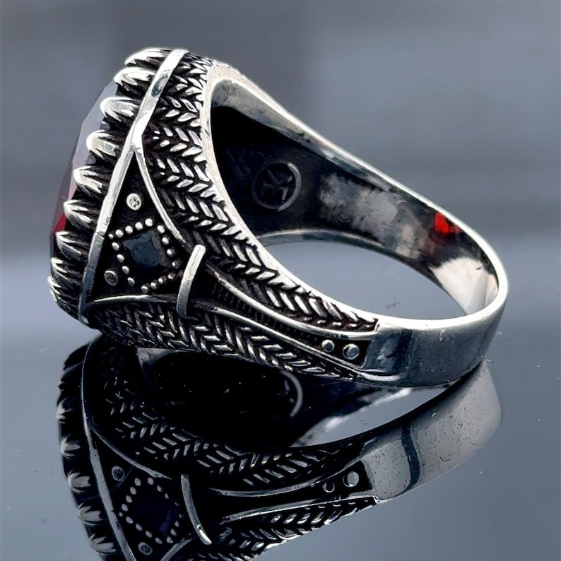 925 Silver Red Ruby Stone Turkish Handmade Men Ring