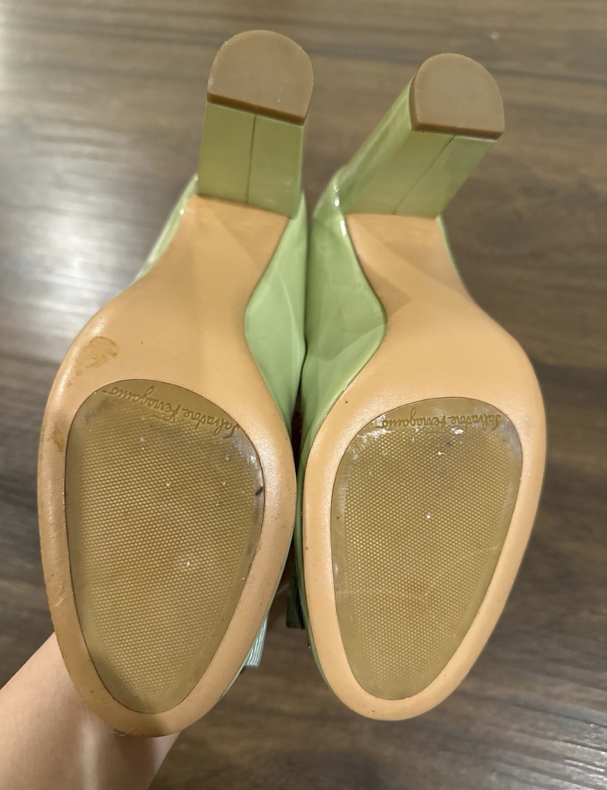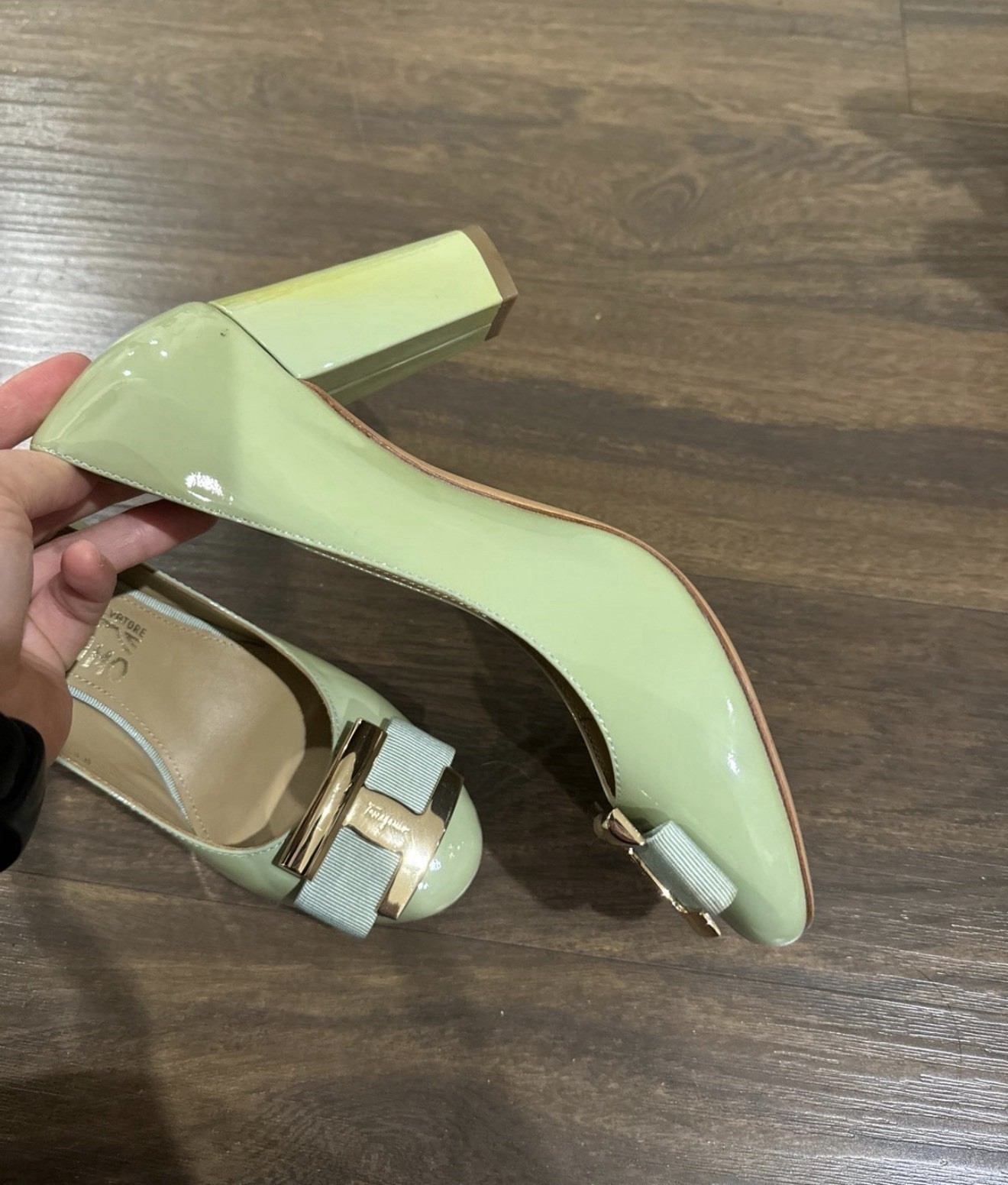 как выглядит SALVATORE FERRAGAMO Ninna Patent Leather Gold Bar Grosgrain Bow Pumps Size 7. фото