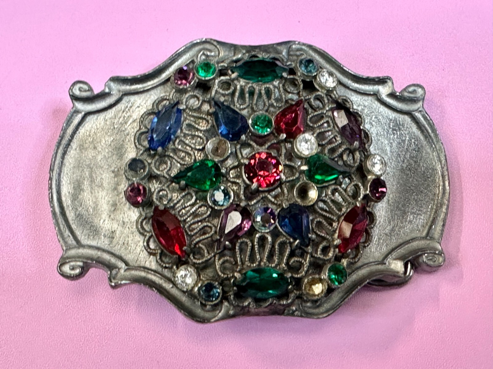 • Mixed Color Rhinestones Silver Tone Western Framed Belt Buckle - Missing Stones