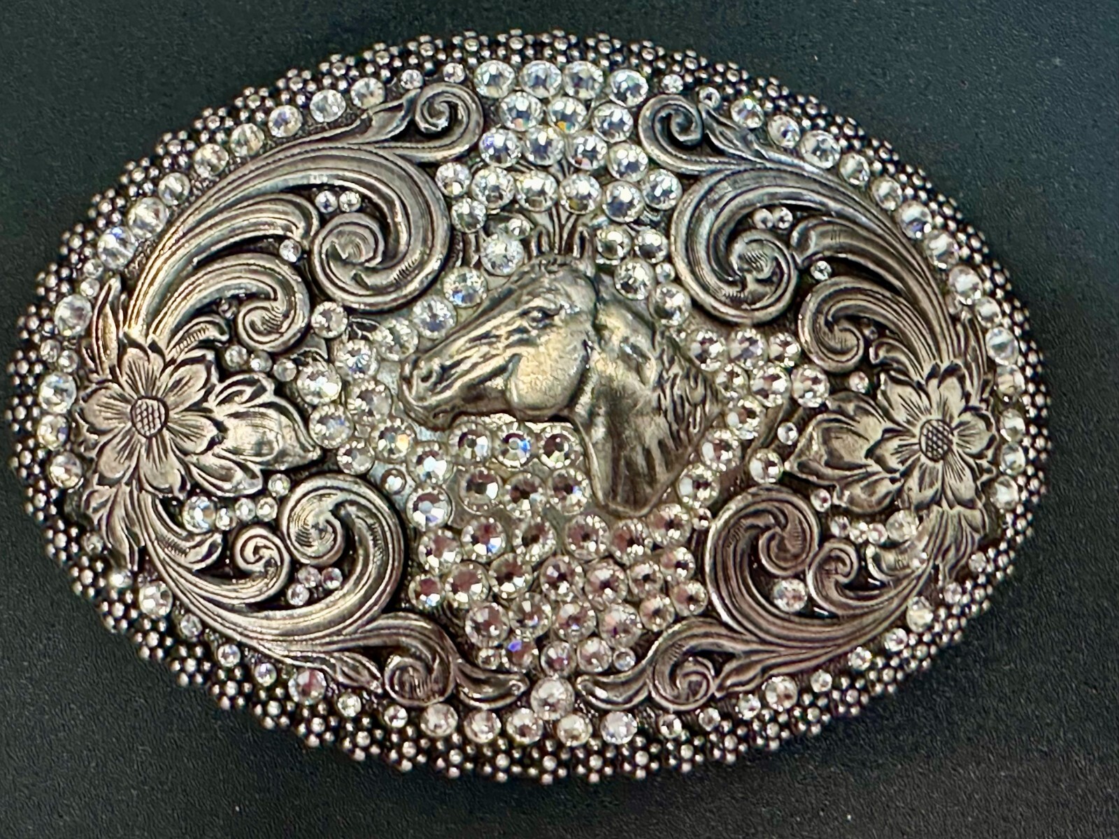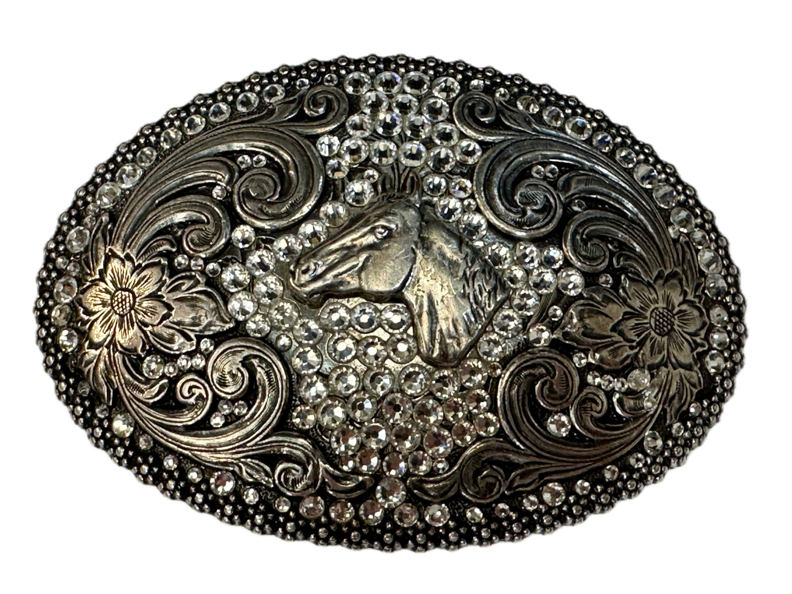 • Horse Head with Rhinestone Accents Silver Tone Western Oval Nocona Belt Buckle