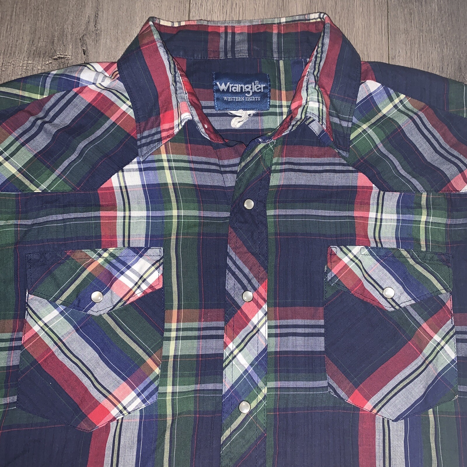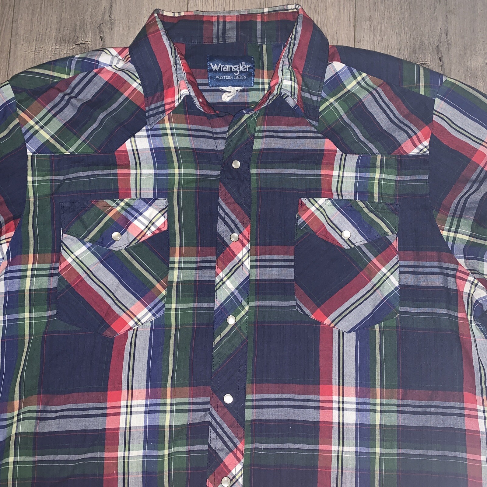 как выглядит Vintage Wrangler Western Shirt Multi Color Plaid Pearl Snap Long Tails Large L фото